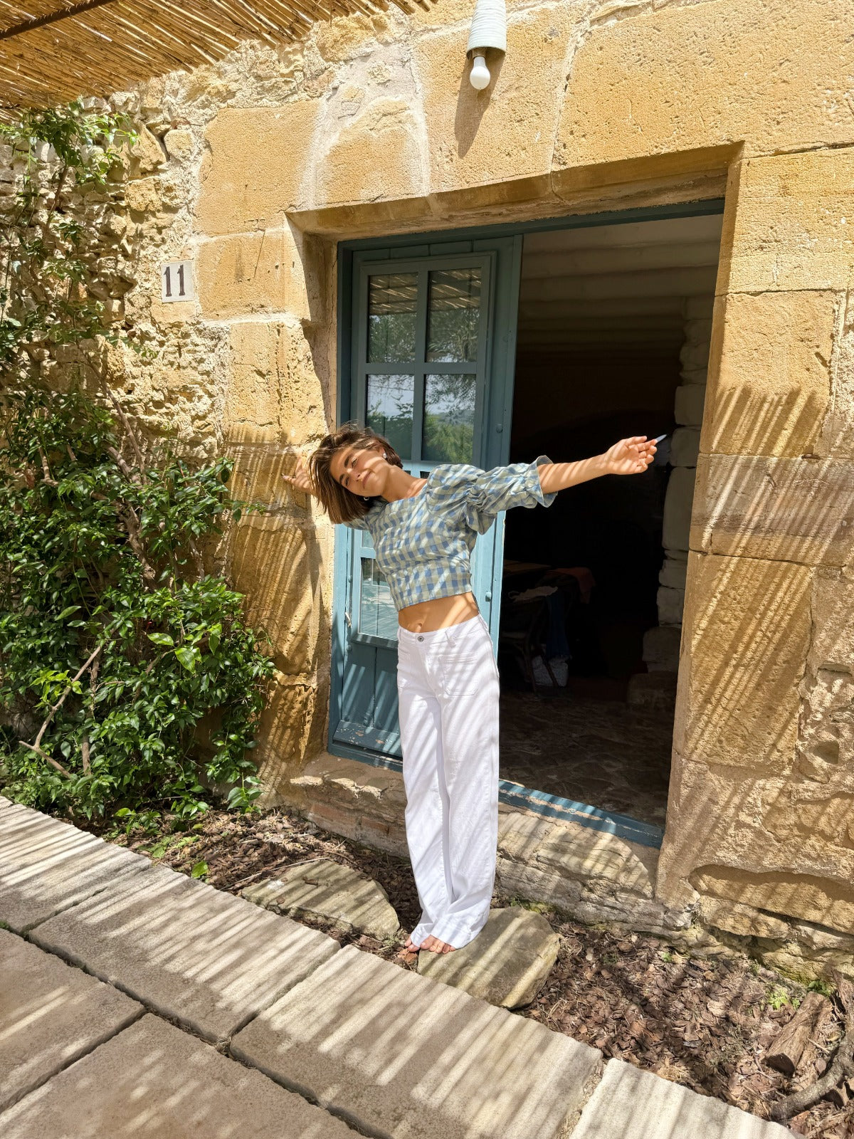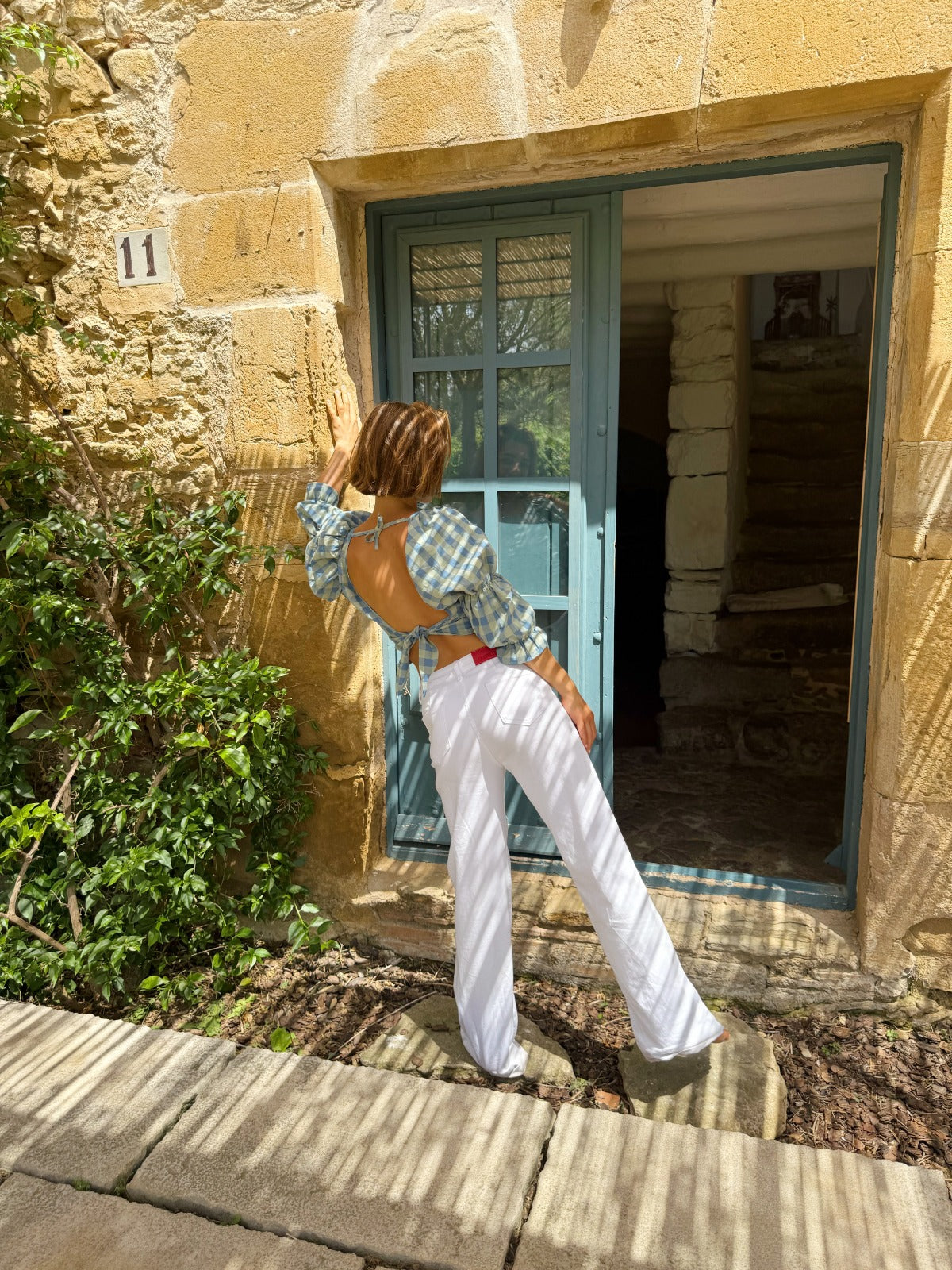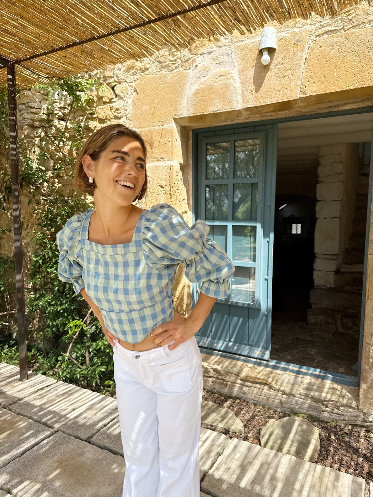 Gingham blouse with a square neckline, double puff sleeves, and an open back with an adjustable tie.