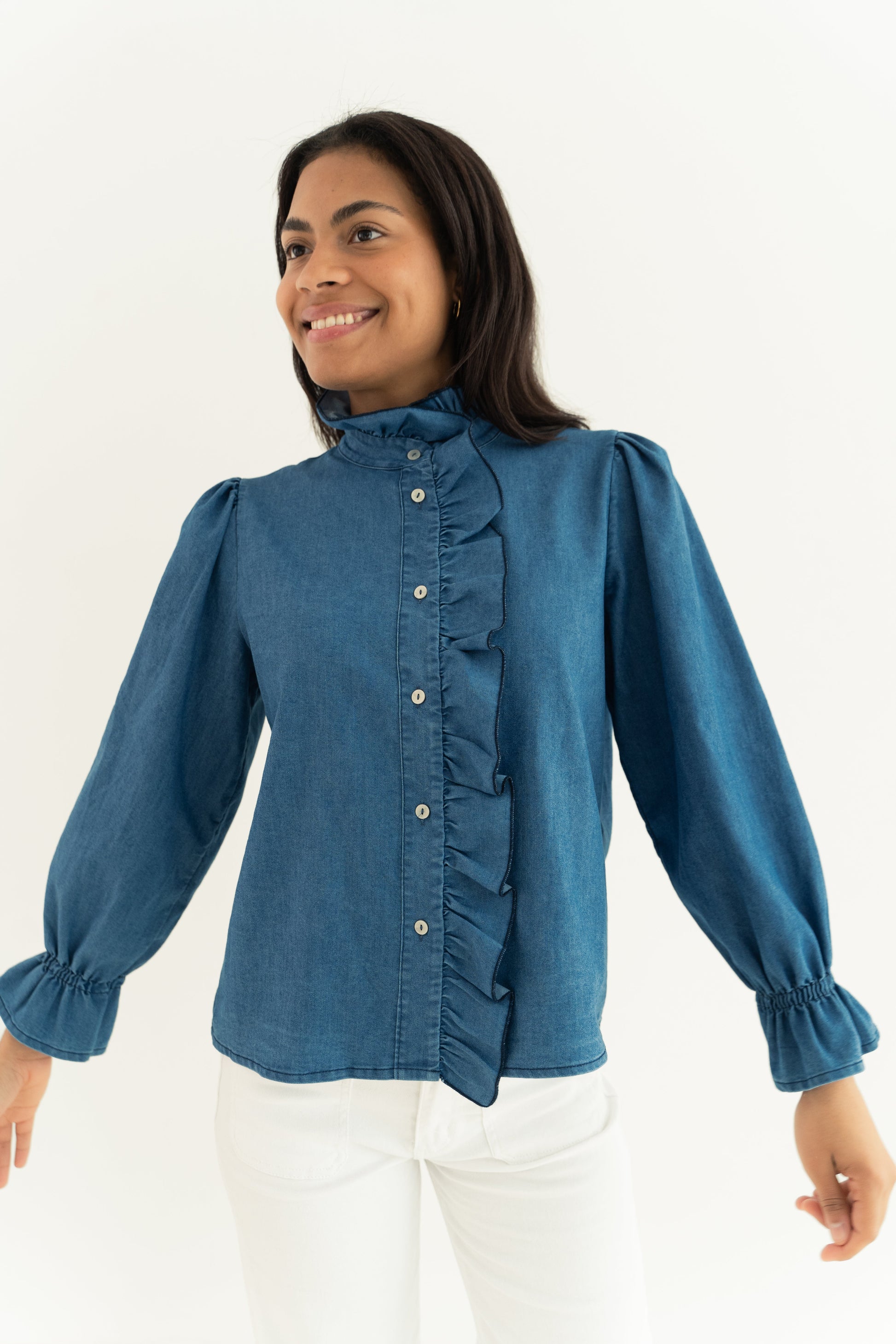Open-button denim blouse with a ruffle at the center and neckline. Long sleeves with adjustable elastic.