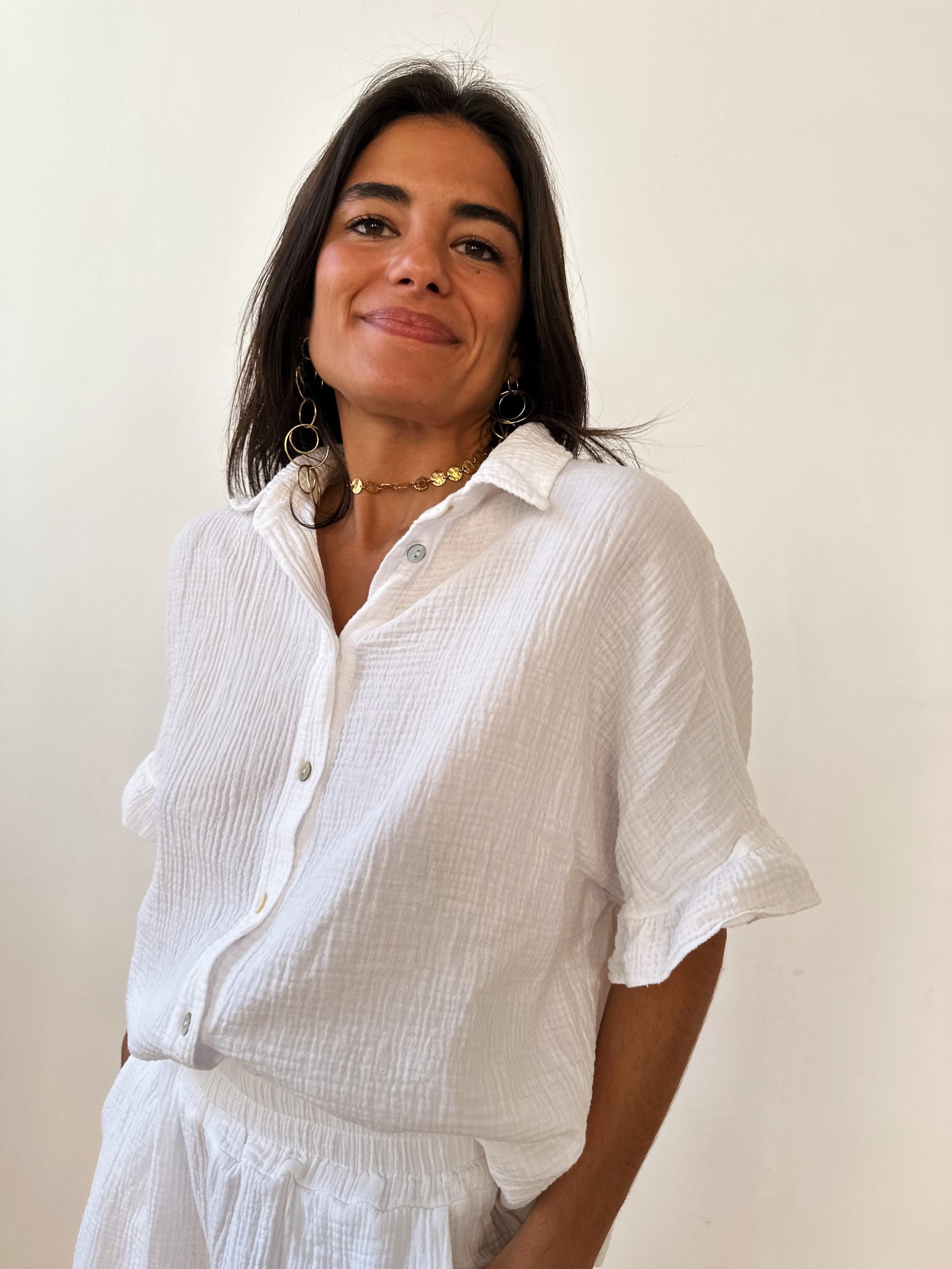Short sleeve shirt with ruffle, central opening with buttons, made of 100% cotton with bamboo fabric.