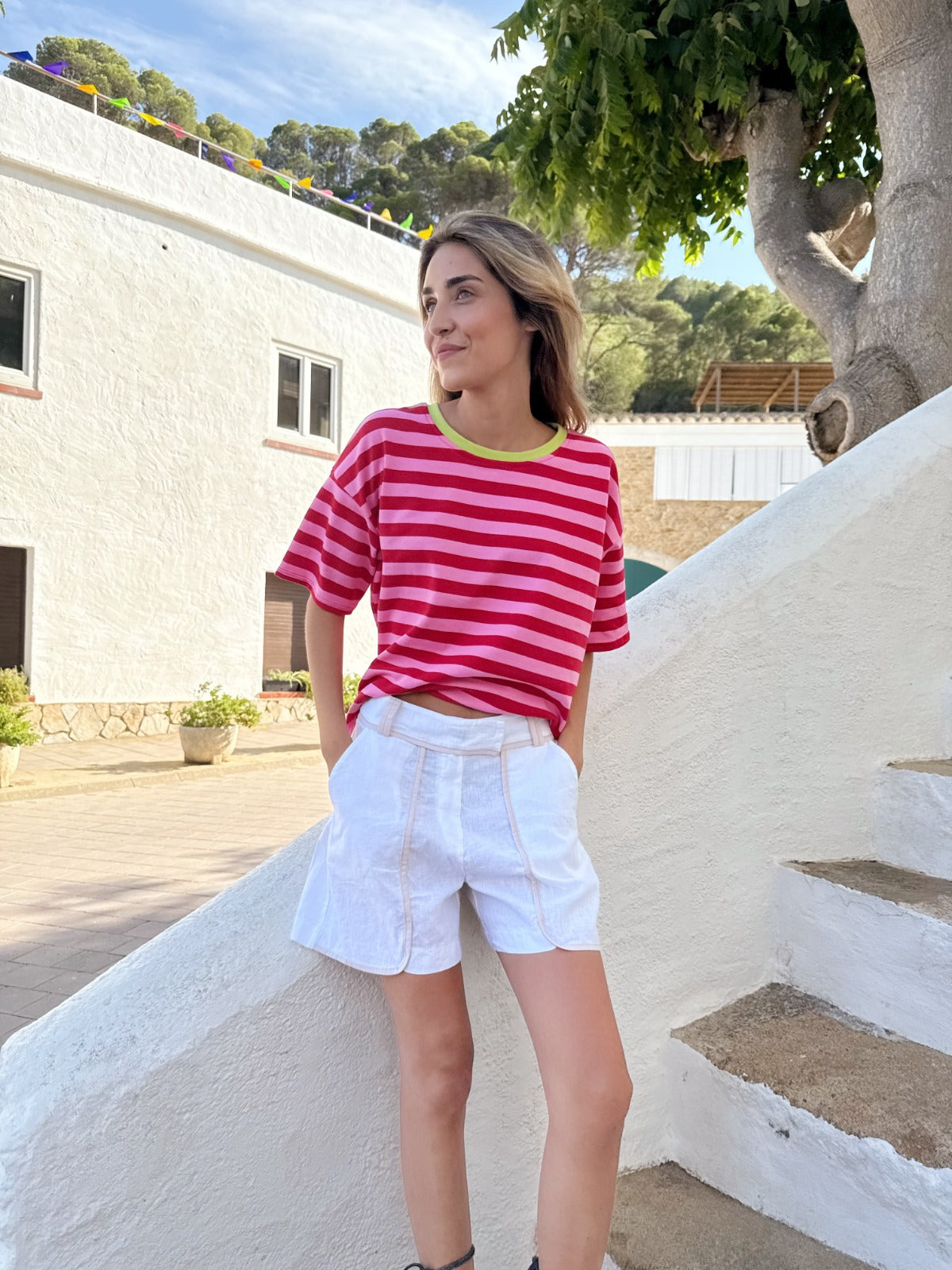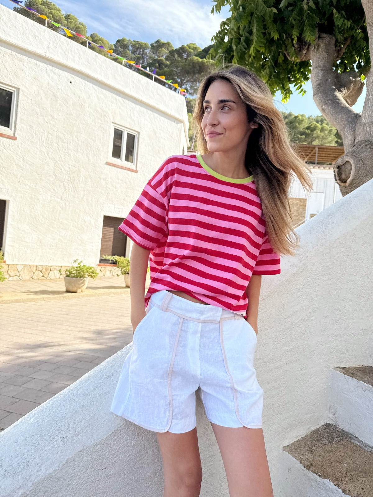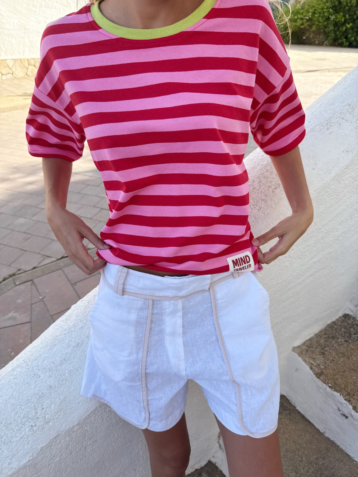 Red and pink striped T-shirt with a green collar. Loose fit and soft fabric for a comfortable and stylish summer look.