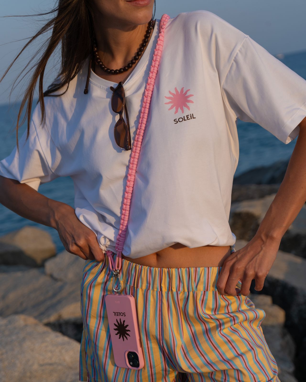 White t-shirt with a graphic sun on the front and a collage-style print on the back with words and a drawing of a sun in pink.