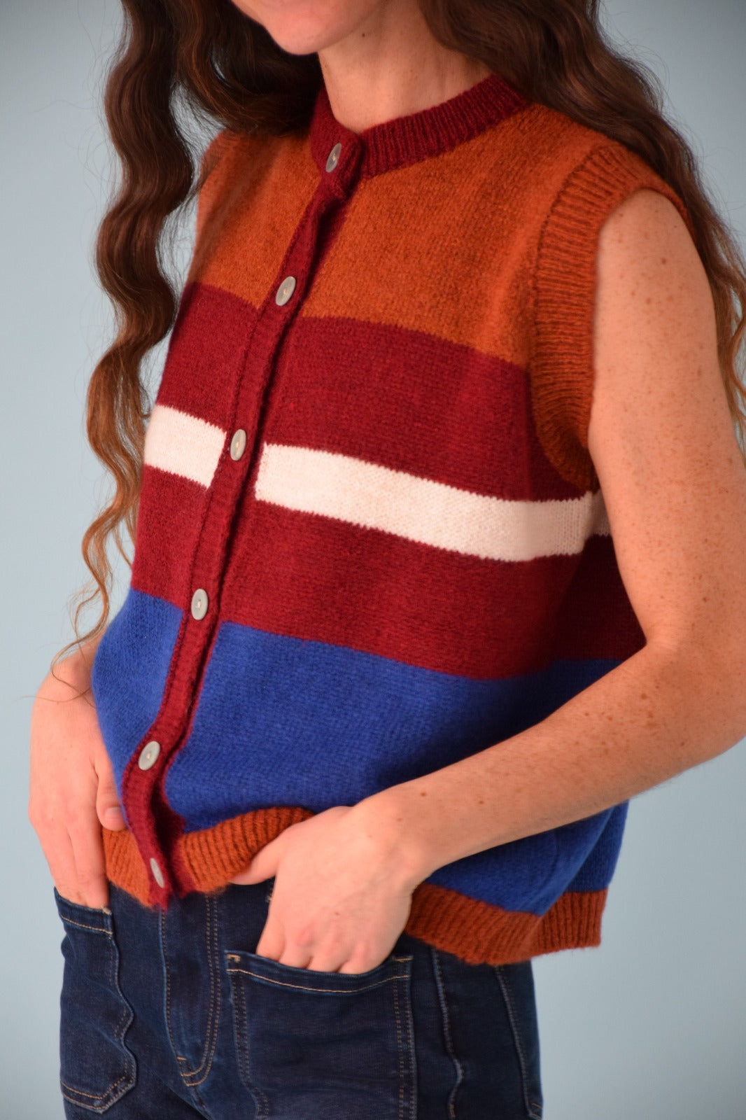 Chaleco de punto sin mangas con cierre frontal de botones y diseño a rayas horizontales en combinación de colores en teja, burgundy y azul. Cuello redondo y terminaciones acanaladas.