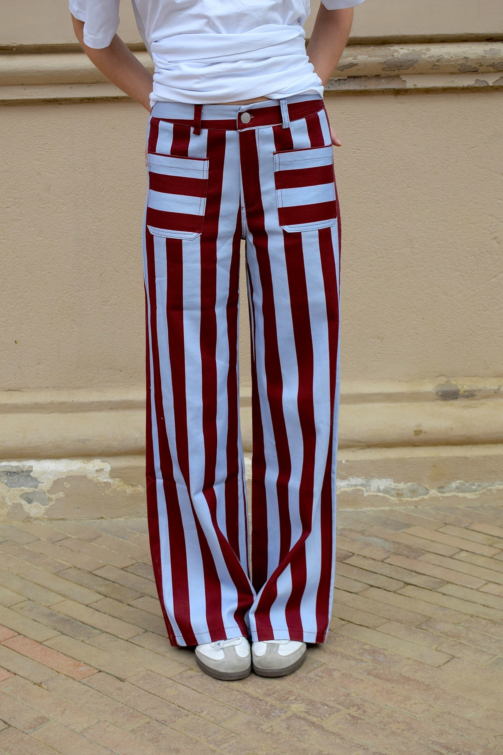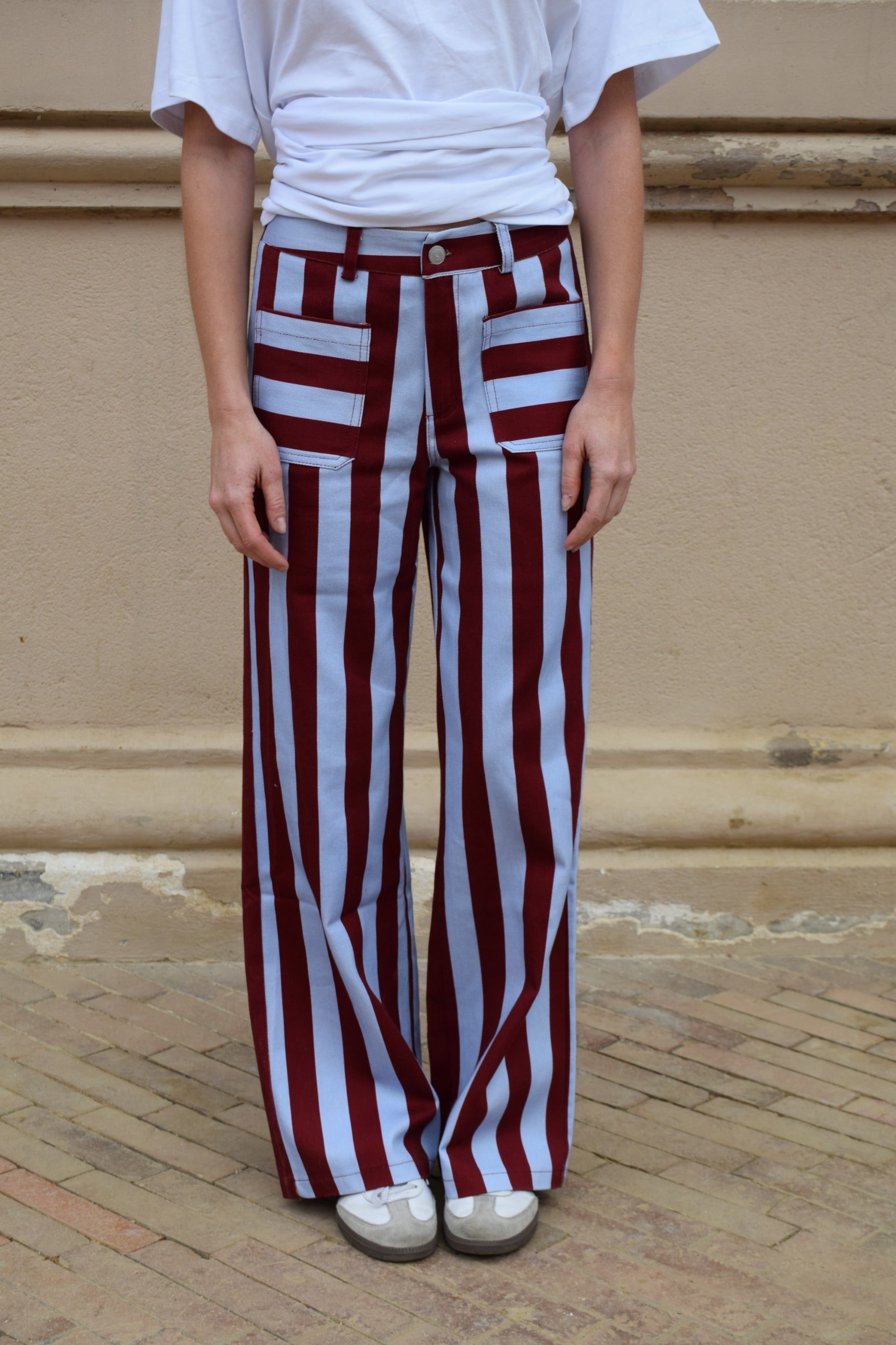 Pantalones de tiro medio y corte recto con un diseño de rayas verticales anchas en contraste de color granate y azul claro. Bolsillos delanteros