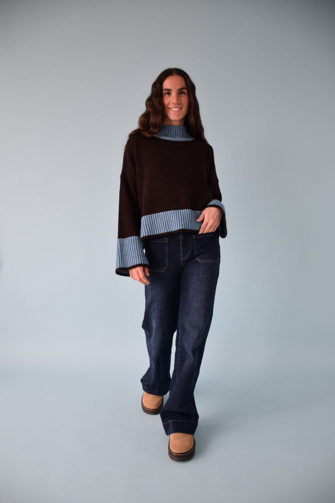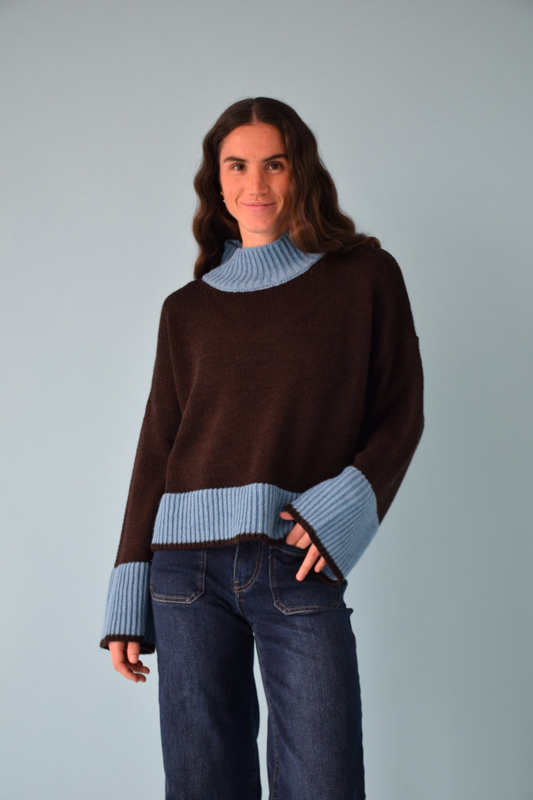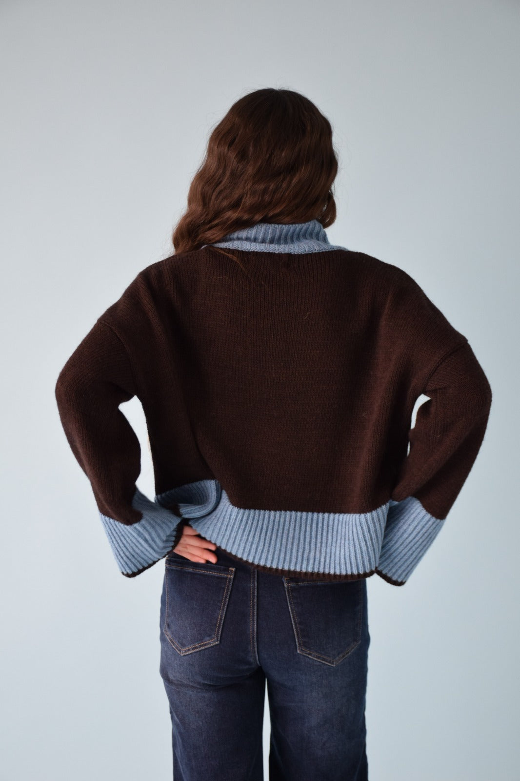 Jersey de manga larga y cuello medio-alto en color marrón chocolate, con puños y bajo en contraste en tono azul.