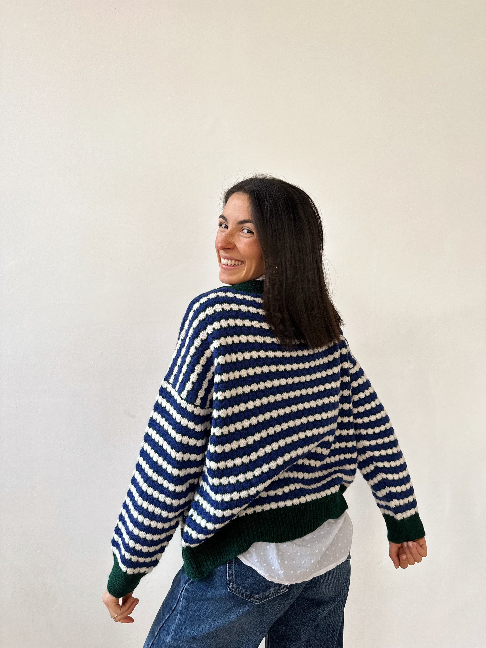 Long-sleeved striped sweater with a wavy effect in shades of green and blue