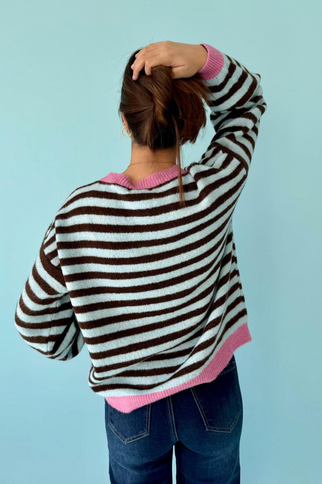 Jersey de manga larga con rayas en color marrón y azul cielo con el cuello, puño y bajo en color rosa.