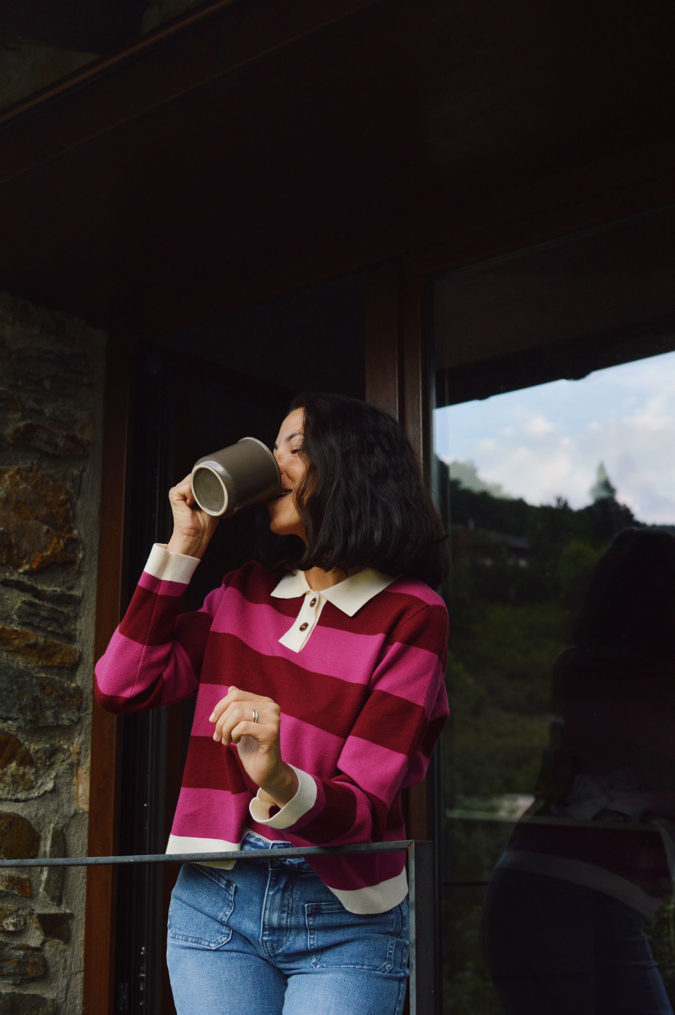 Long-sleeved polo shirt Fuchsia and burgundy two-tone with a beige lapel collar. It's a classic and versatile design, ideal for a sophisticated and colorful look.