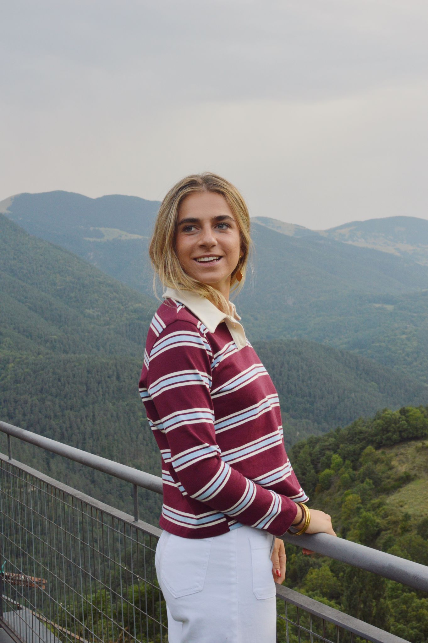 Burgundy, beige, and sky blue striped long-sleeved polo shirt with a burgundy lapel collar. It's a classic and versatile design, ideal for a sophisticated and vibrant look.