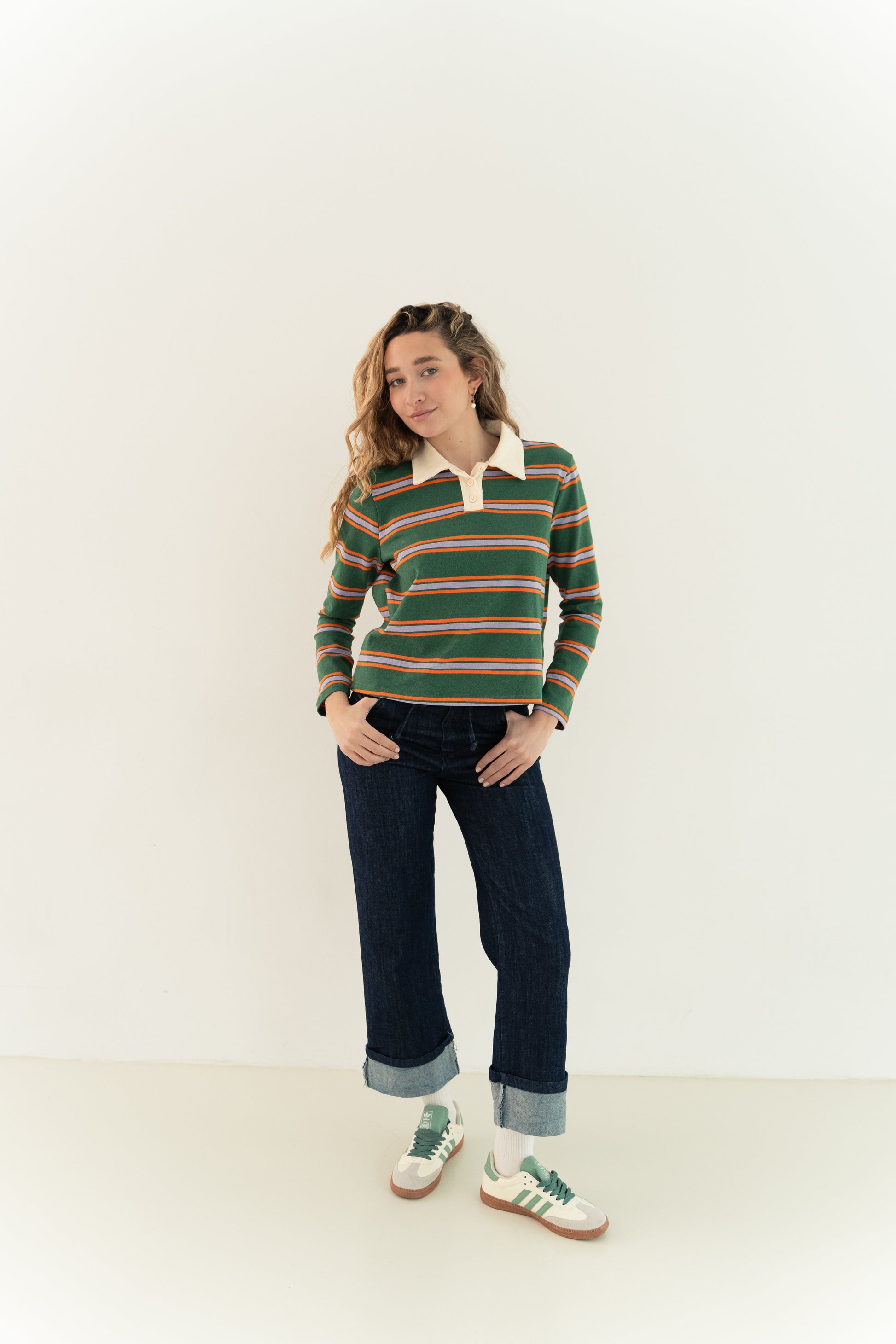 Long-sleeved green, orange, and lavender striped polo shirt with a green lapel collar. It's a classic and versatile design, ideal for a sophisticated and vibrant look.