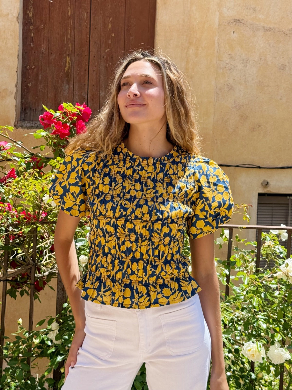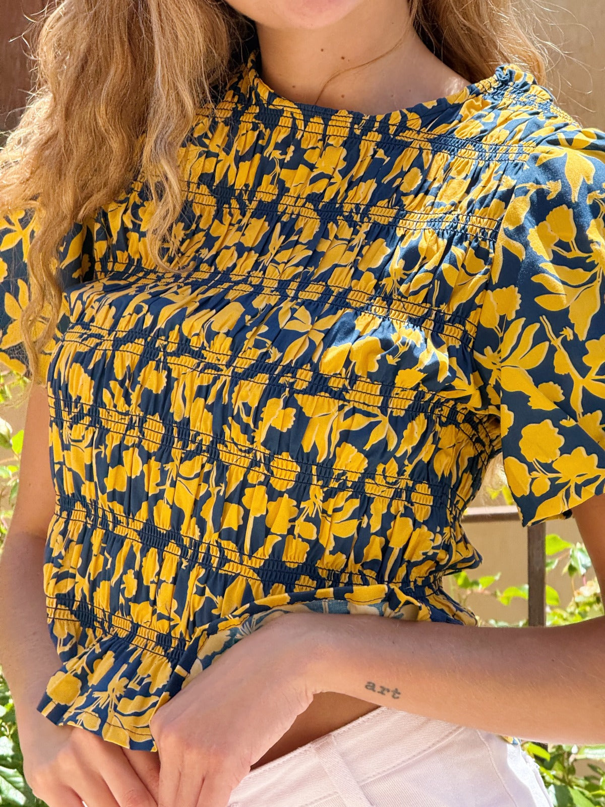 Top con cuerpo fruncido y mangas abullonadas, confeccionado en tejido ligero con estampado floral en tonos mostaza sobre fondo azul marino. Un diseño cómodo con un toque especial.