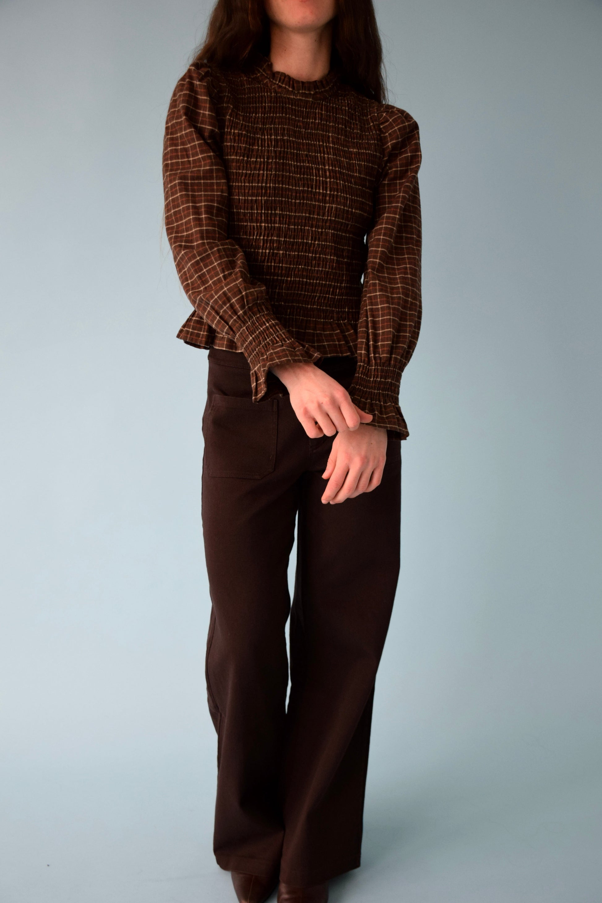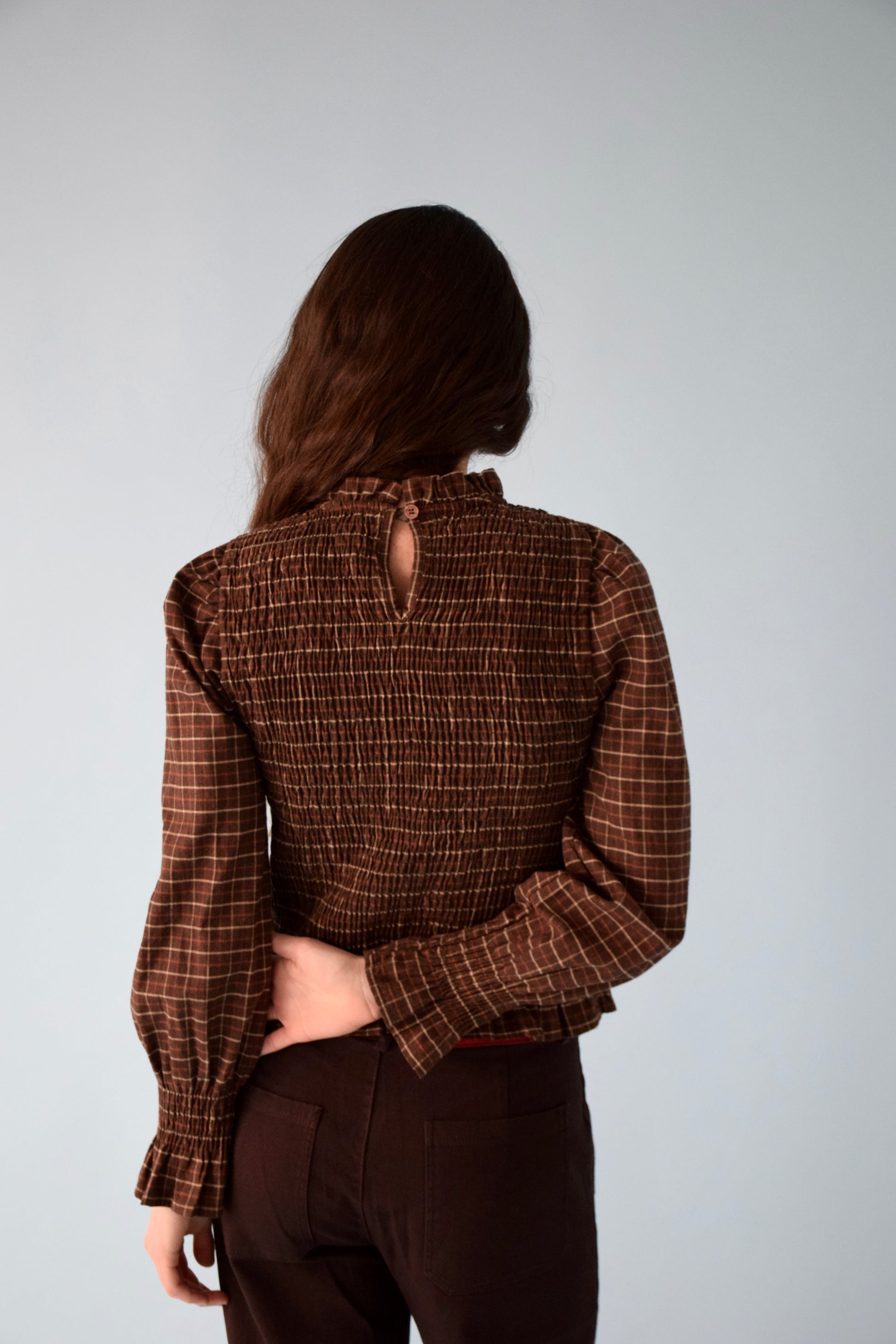 Top de cuadros en color marrón chocolate con nido de abeja en cuerpo y puños, acabado con volantes en bajo, cuello y mangas.