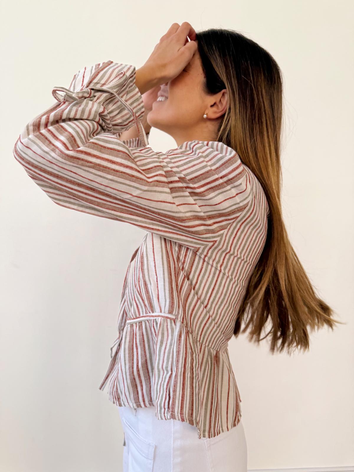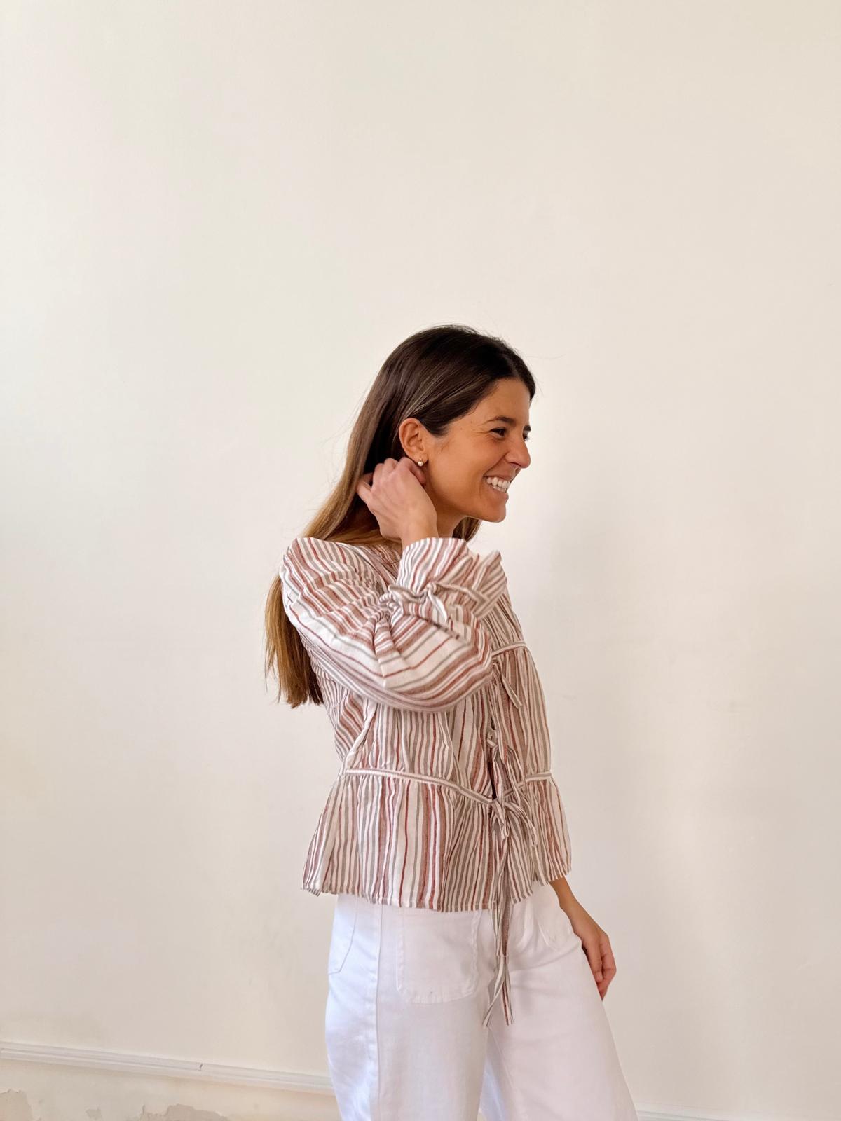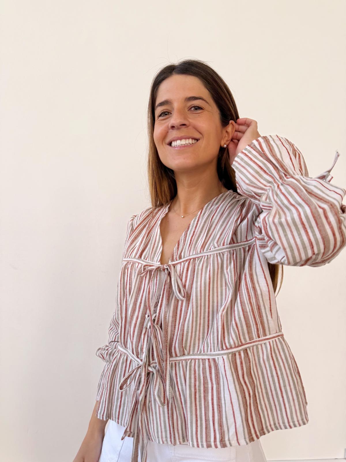 Blusa color crudo con rayas en tonos rojo y azul grisáceo con cierre con lazadas. Detalle de lazo en el puño.
