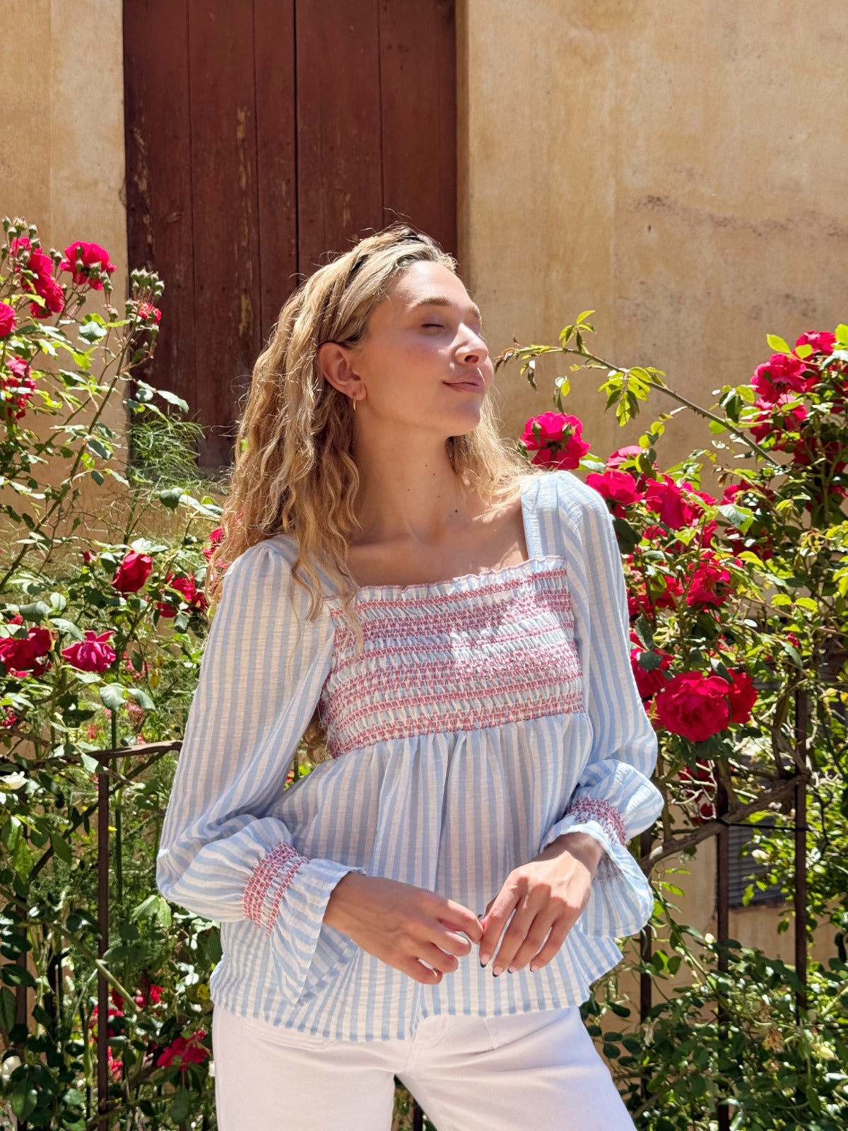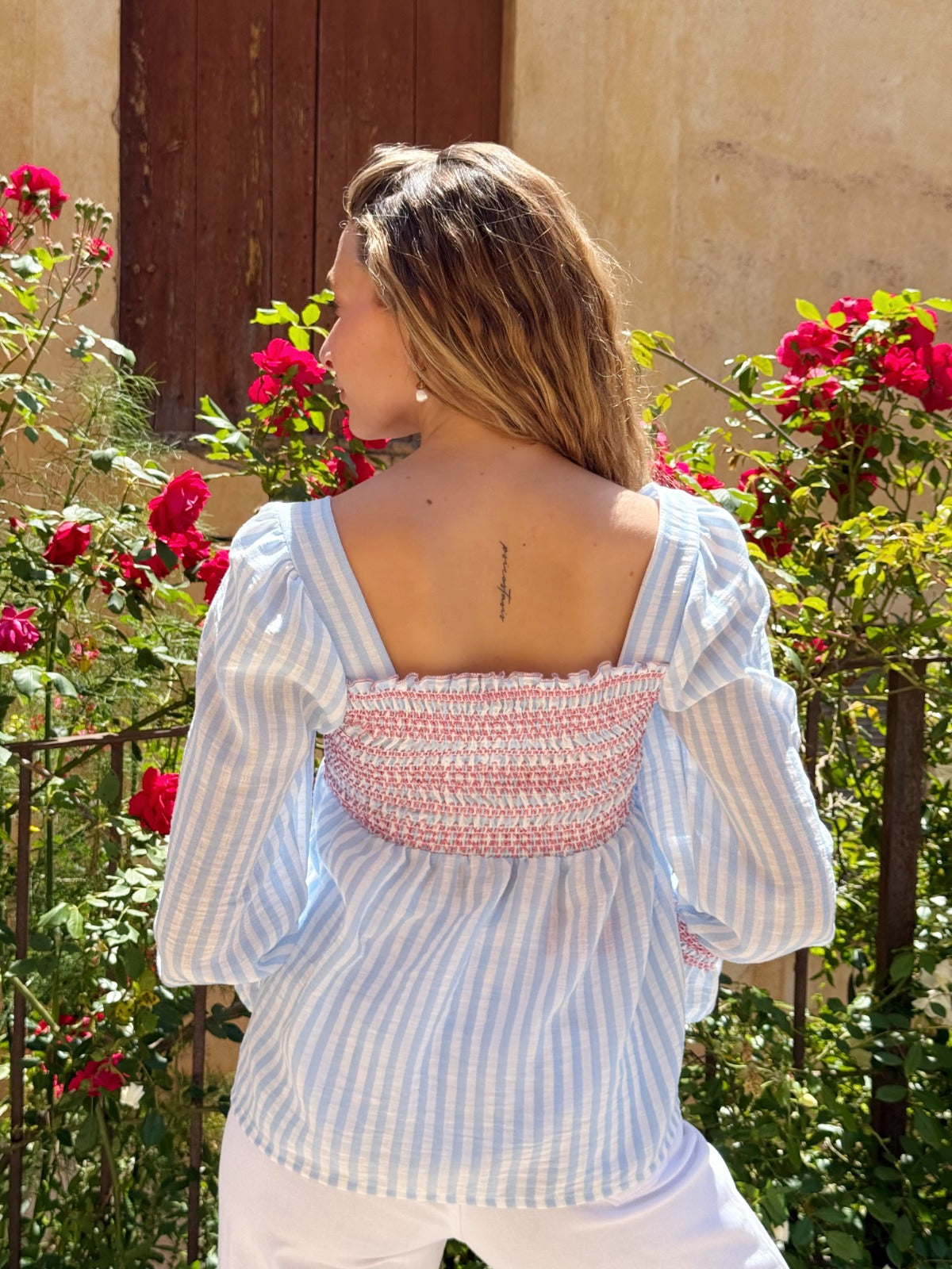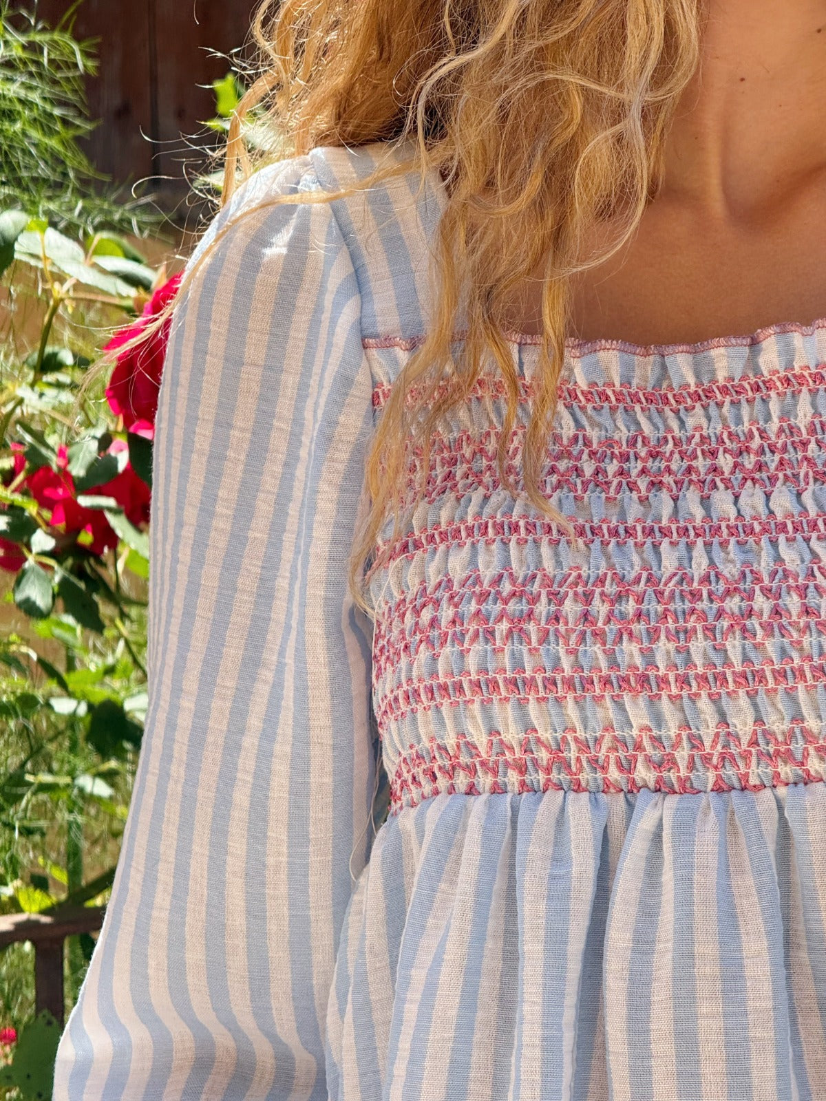 Blusa ligera con estampado de rayas verticales azul cielo y blanco. Diseño con escote cuadrado y fruncido tipo nido de abeja en el pecho con detalle en hilo rosa. Mangas largas ligeramente abullonadas. Ajuste cómodo y favorecedor.