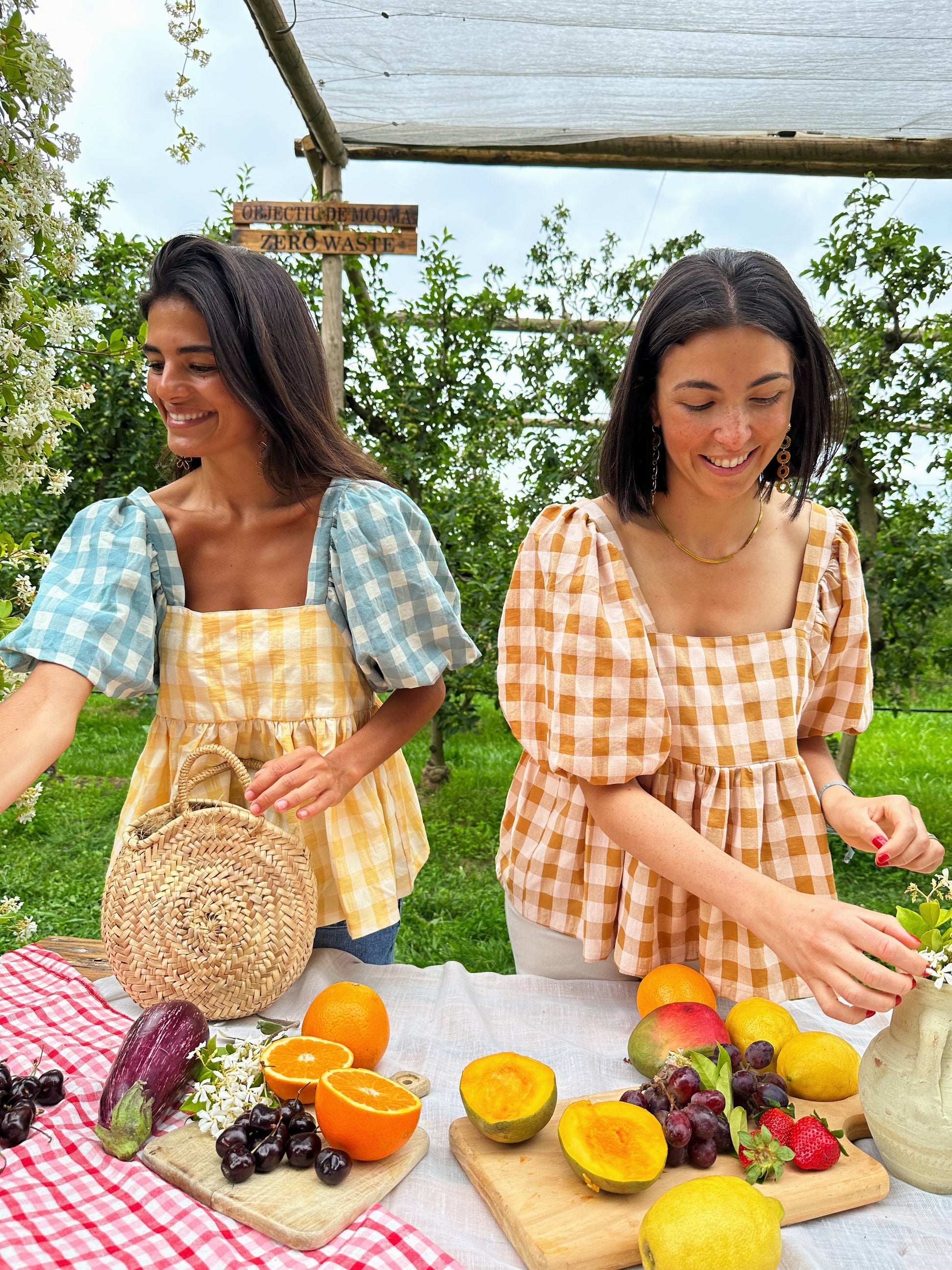 Blusa de vichy, escote cuadrado, manga corta farol abullonada, volante altura pecho y espalda abierta.