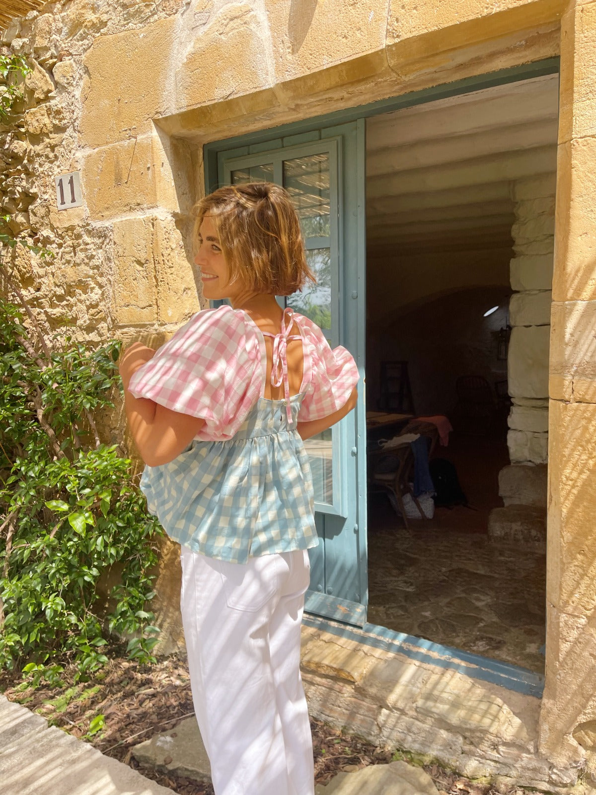 Blusa de vichy de color azul, escote cuadrado, manga corta farol abullonada de vichy en color rosa palo, volante altura pecho y espalda abierta.