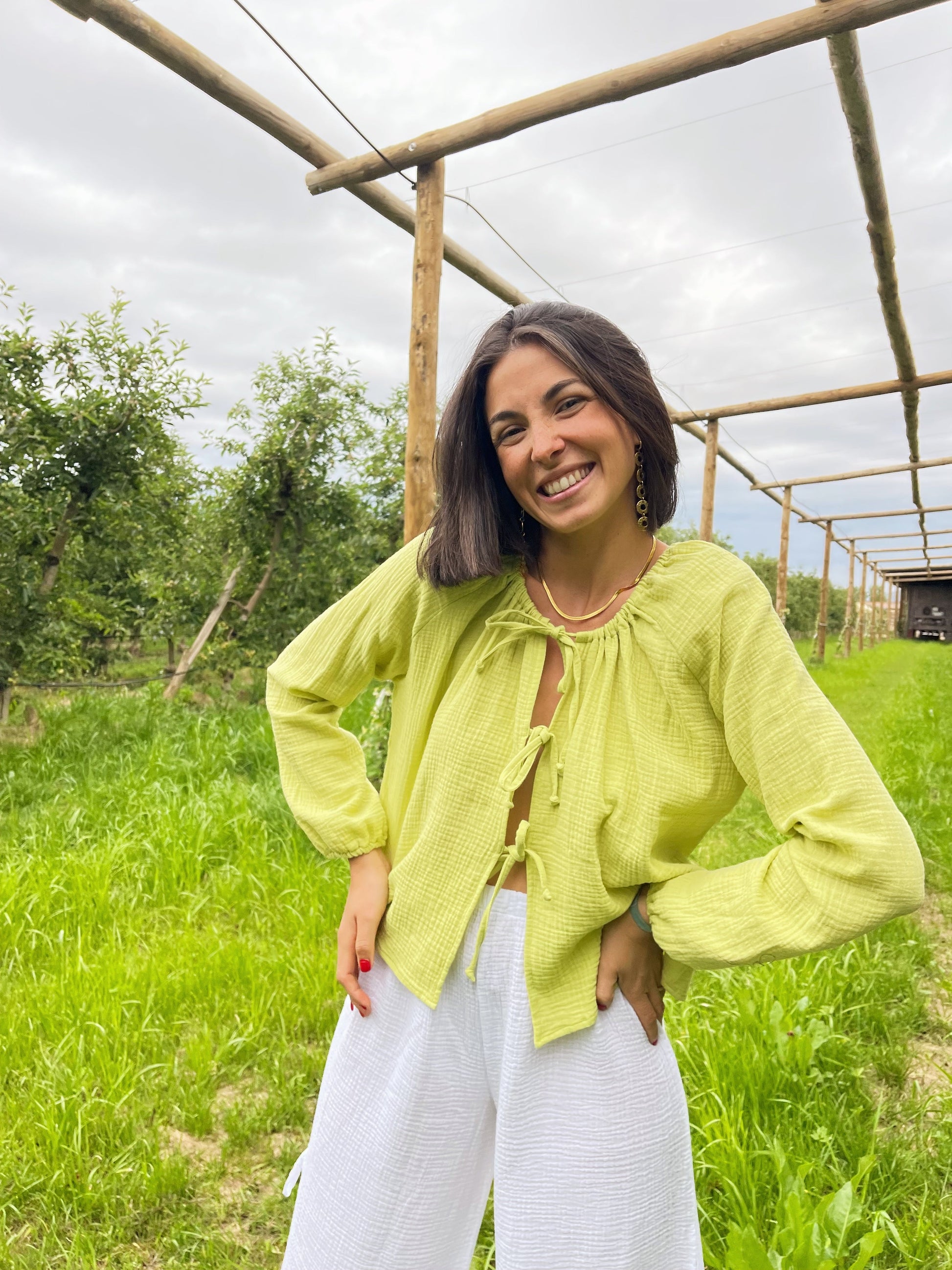 Blusa de algodón, manga larga acabada con una goma elástica, abertura central con tres lazos.