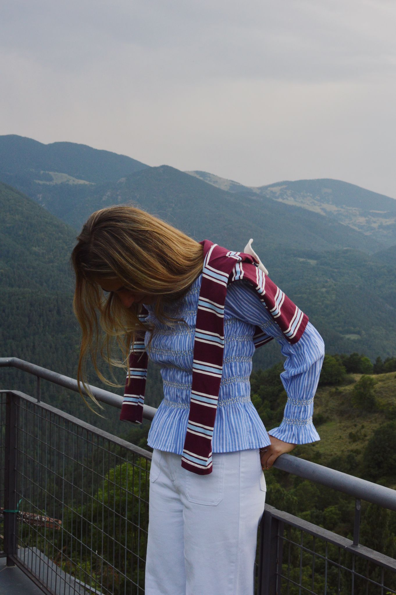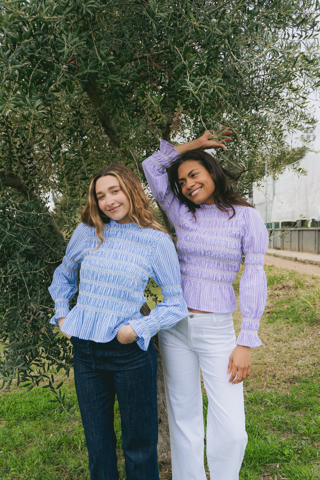 Blusa de manga larga de nido de abeja de color azul con volante en el bajo y en el cuello y mangas abullonadas con detalle doble de nido de abeja