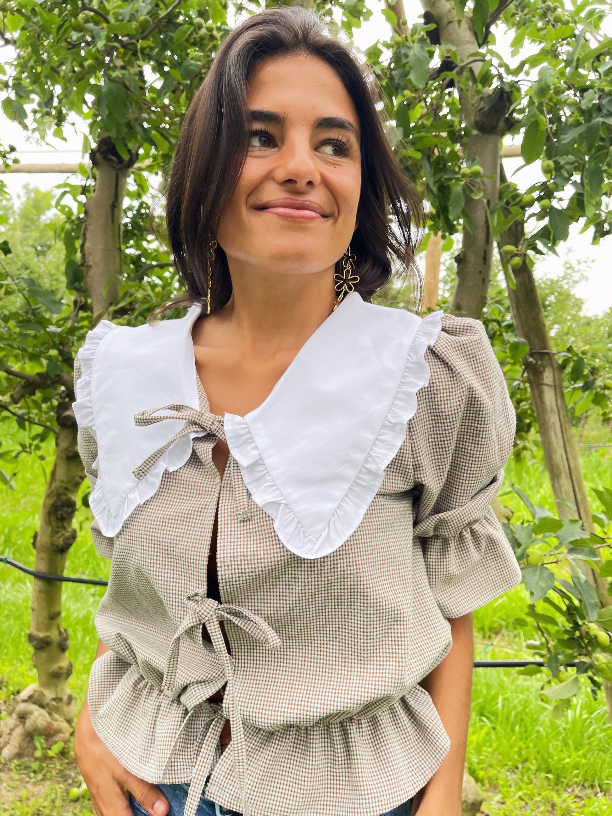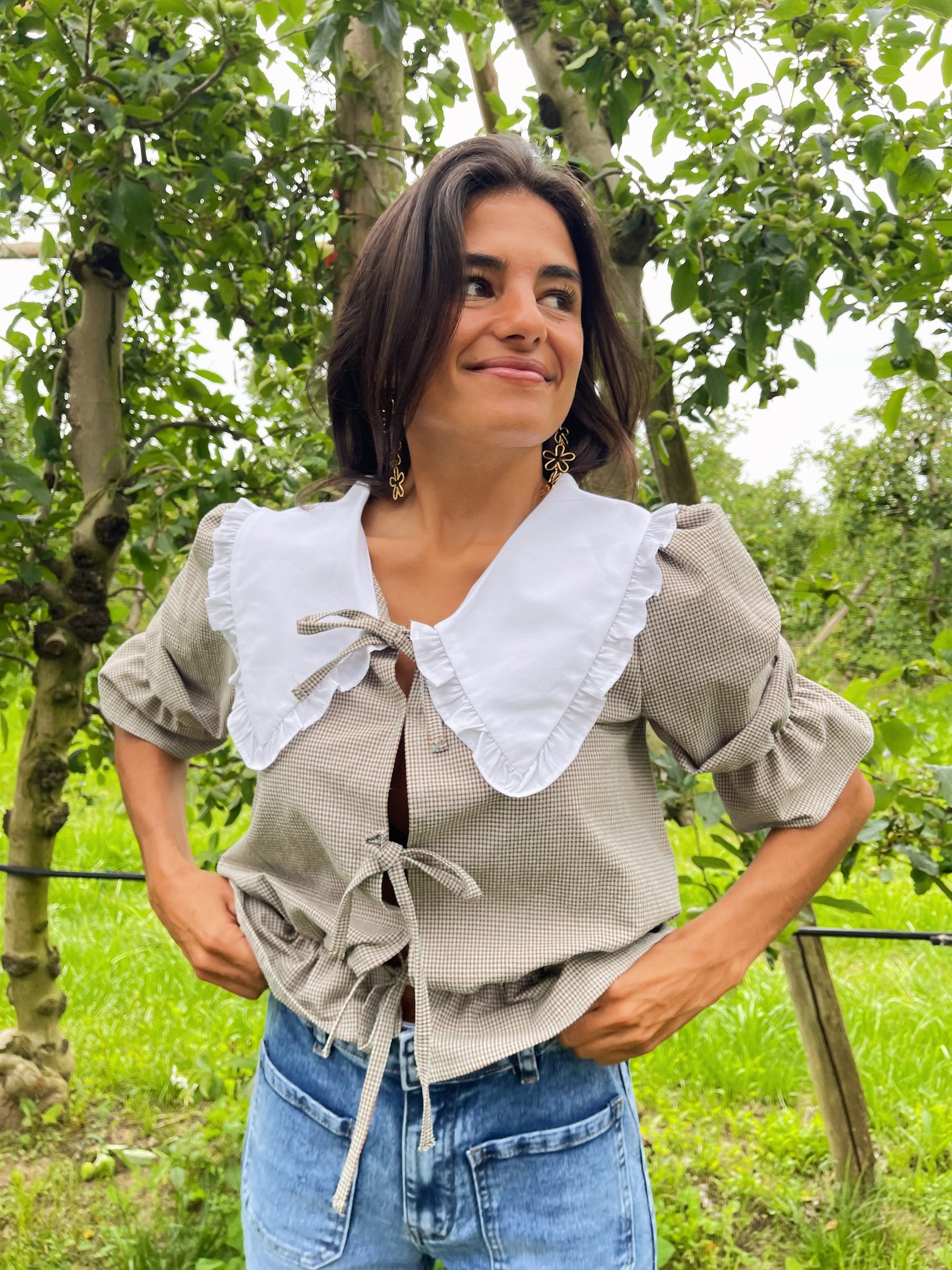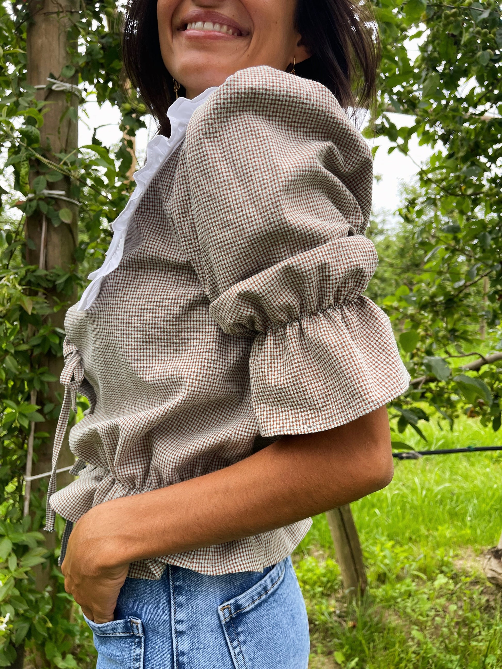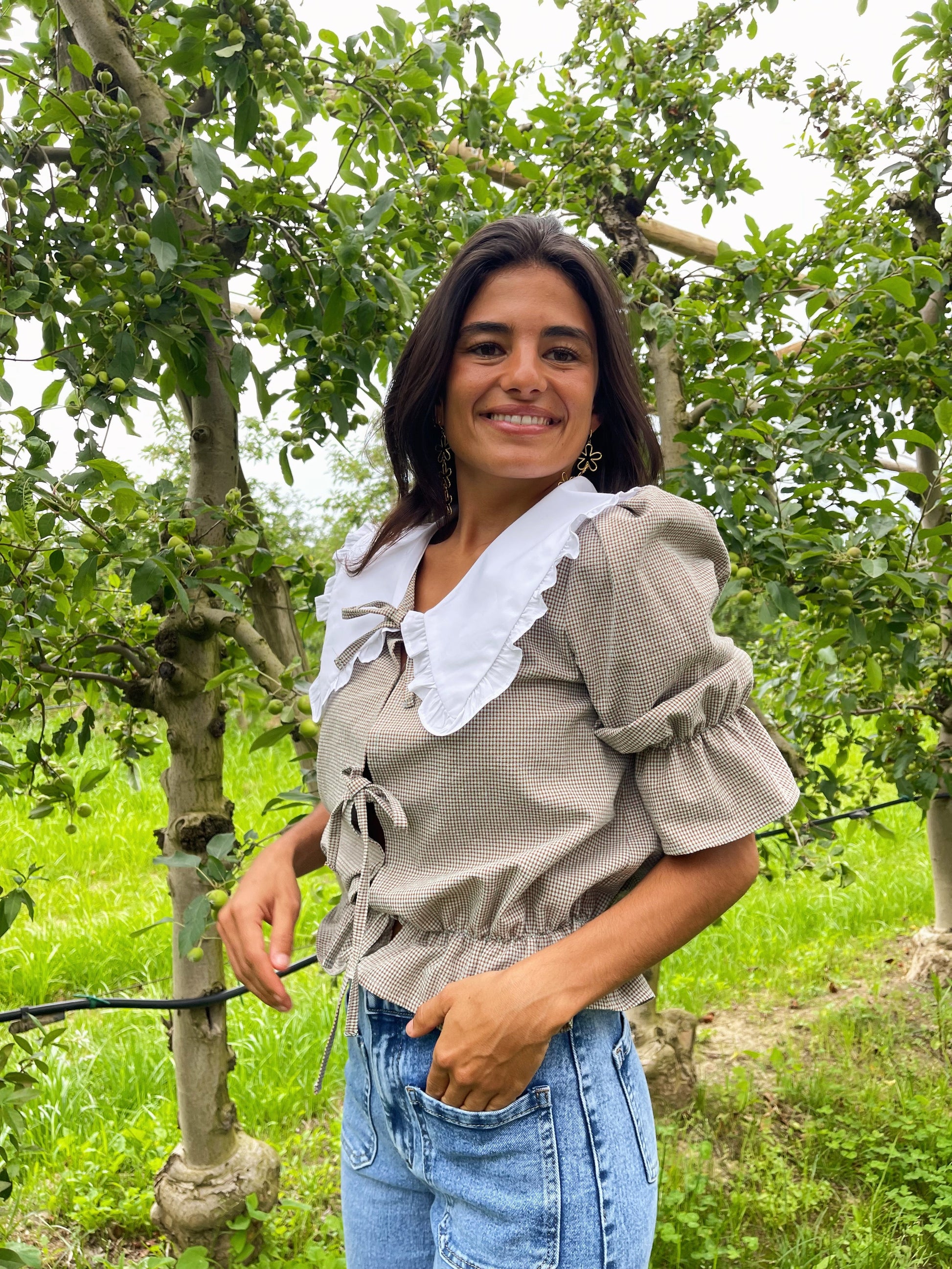 Blusa cuello bobo, manga 3/4 acabada con volante, abertura central con tres lazos y acabada con volante.