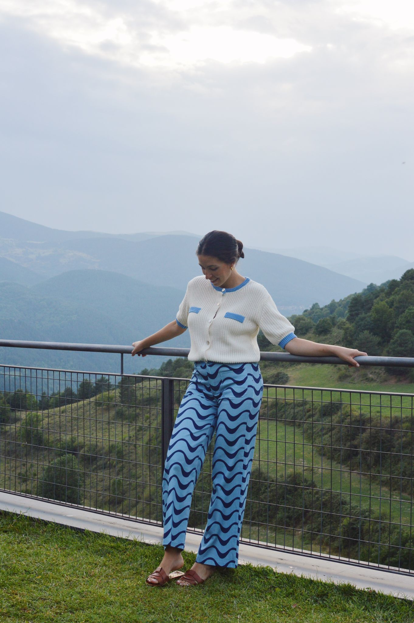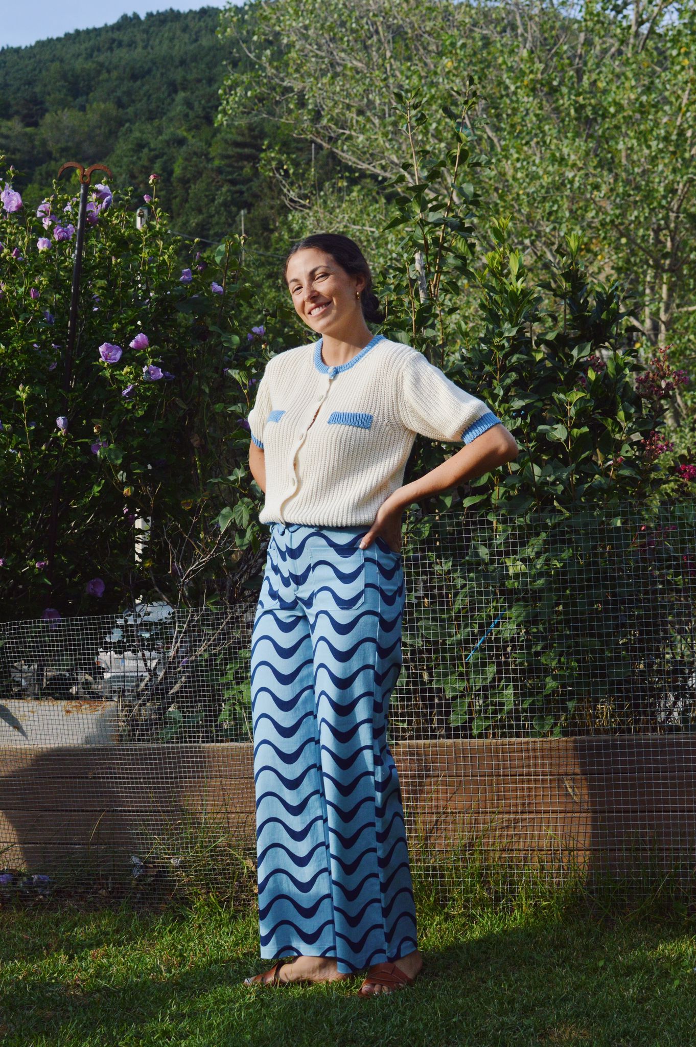 Cárdigan de punto en color blanco roto, de manga corta, con elegantes ribetes en azul que combinan con el cuello y las tapetas decorativas del pecho, simulando bolsillos.
