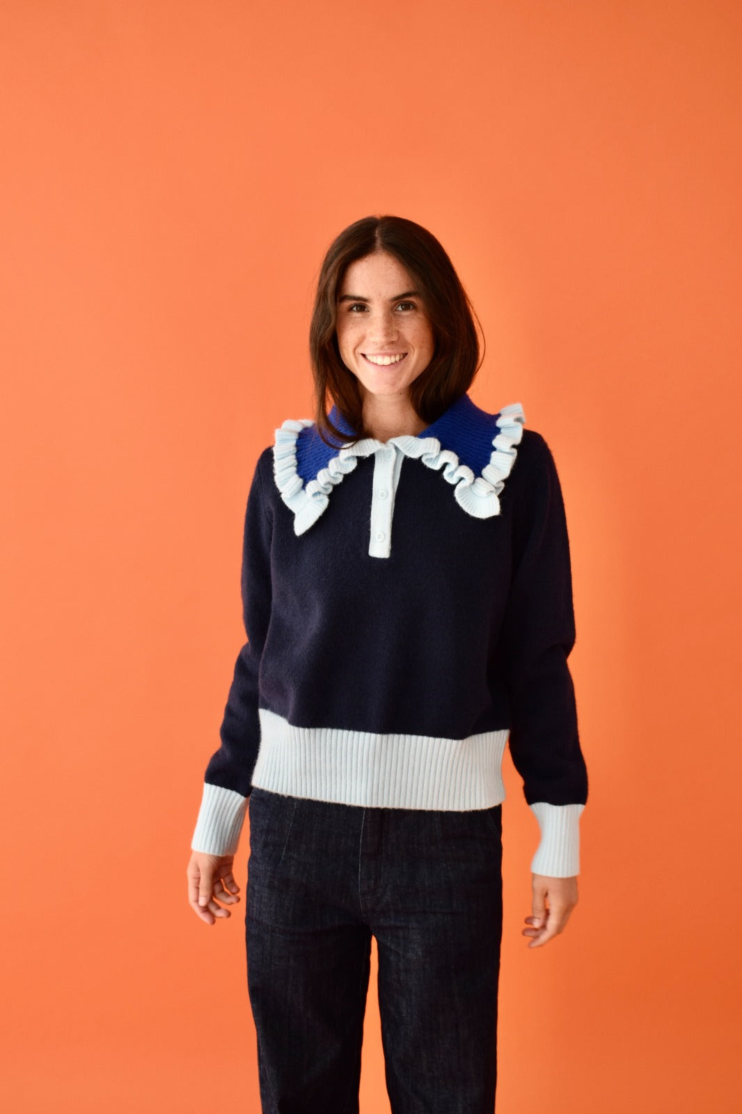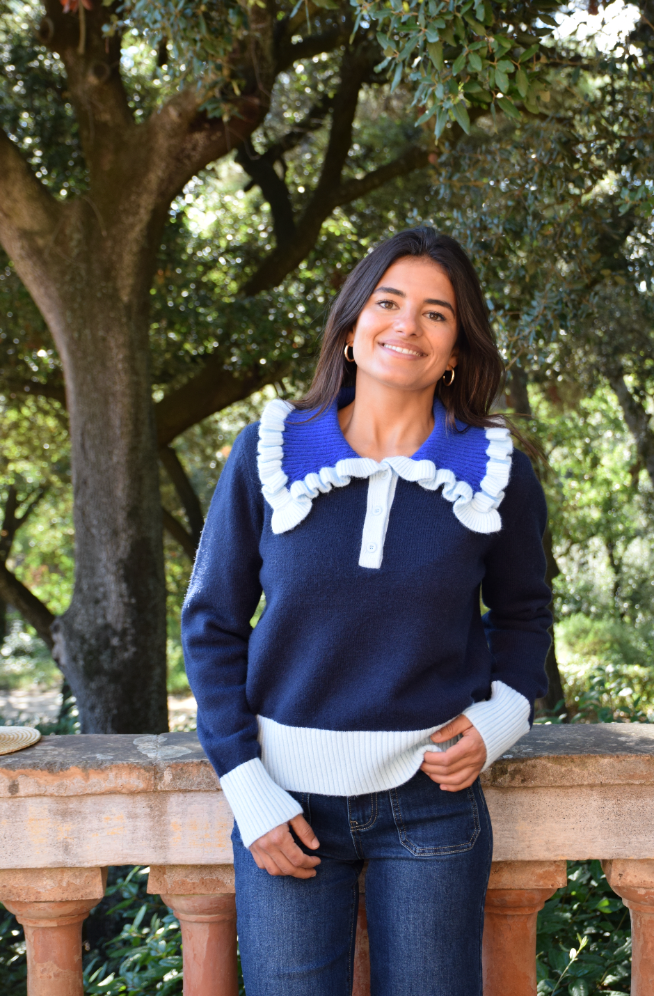 Jersey de punto con cuello tipo polo de doble capa en contraste de color azul marino y celeste, acompañado de un detalle de volante ondulado en el borde exterior. Incluye una tapeta de tres botones en la parte delantera. El bajo y los puños tienen un ribete acanalado en contraste de color celeste.