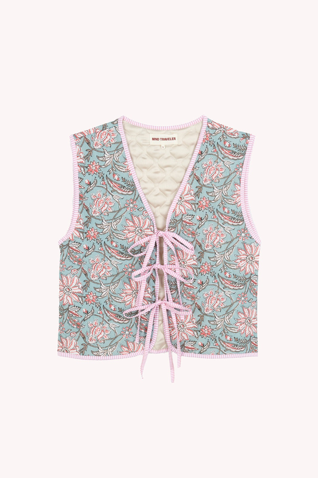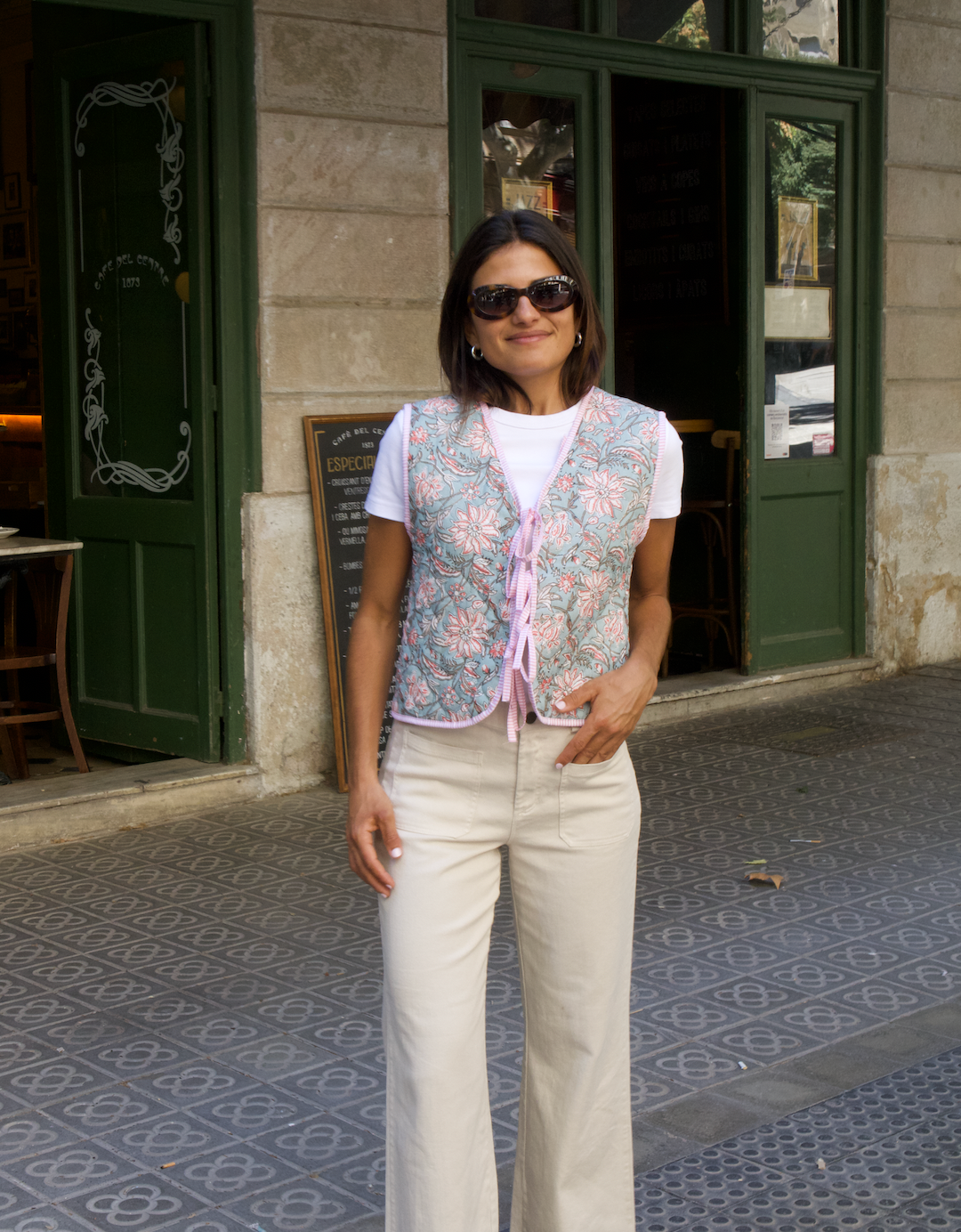 Chaleco de cuello pico con estampado floral en tonos verde y rosa. Los vivos son de rayas rosas y blancas. Con atadura delantera doble con lazada.