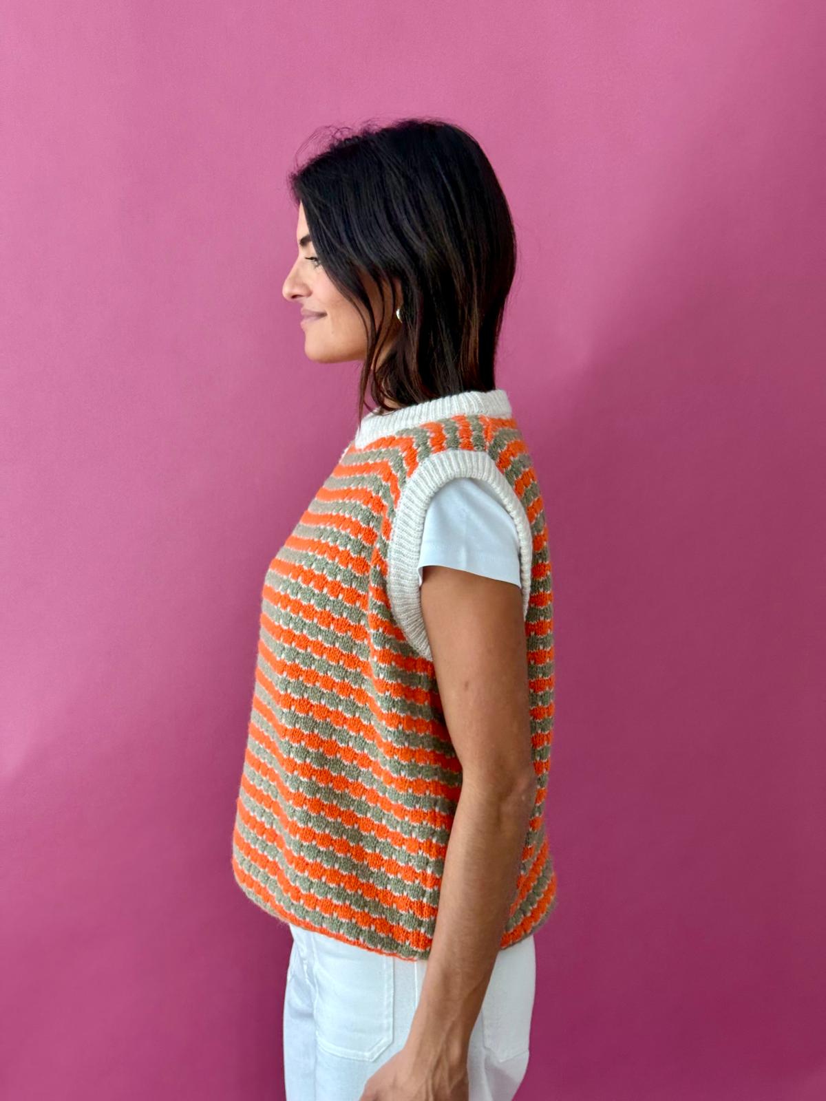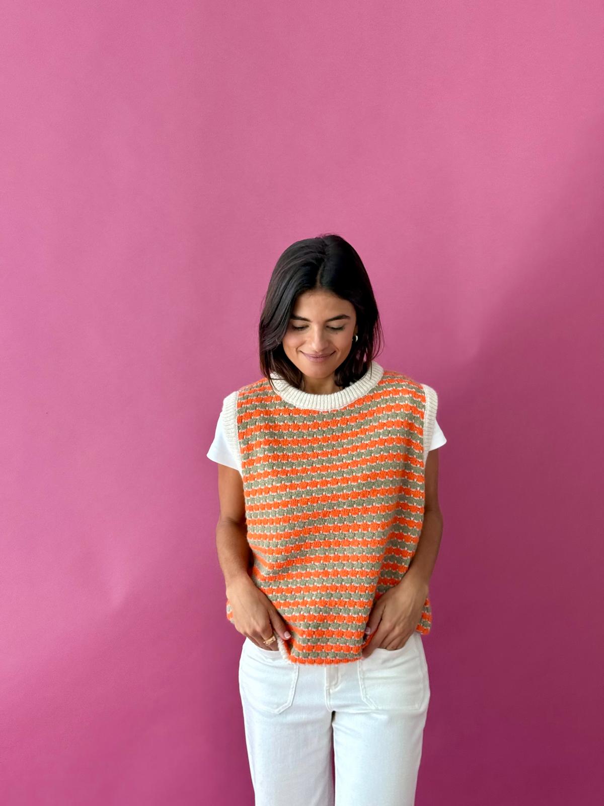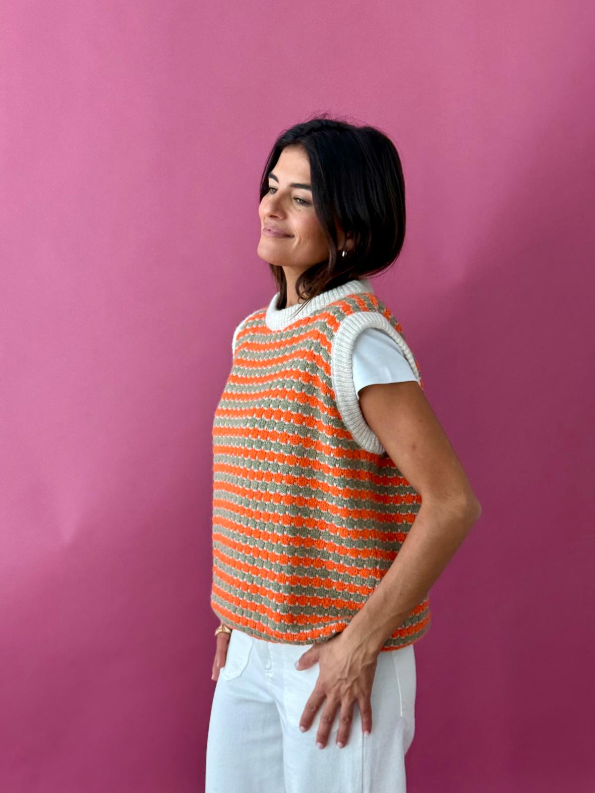 Chaleco de punto con efecto ondulado en tonos verde kaki, naranja y beige.