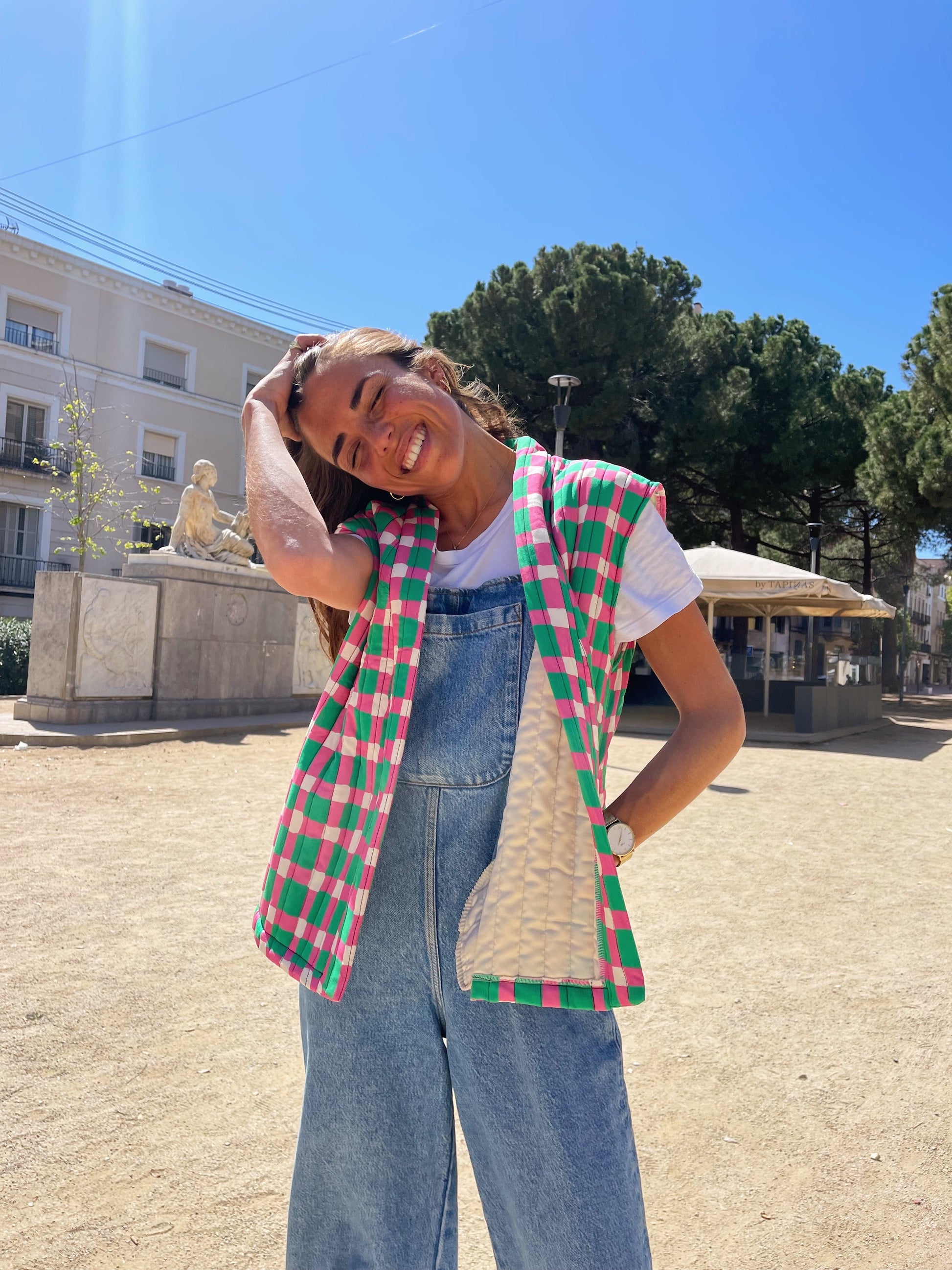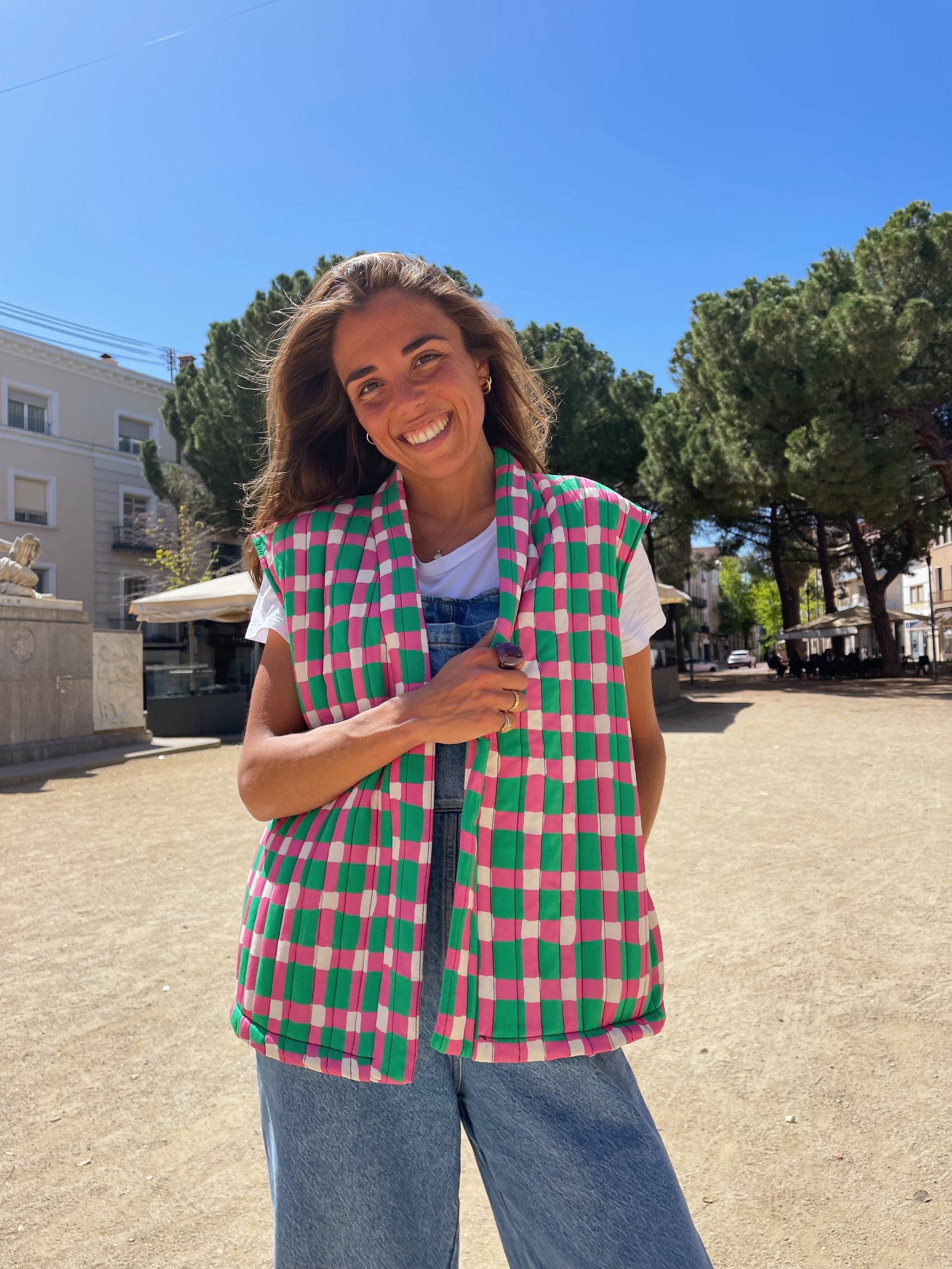 Chaleco estampado de cuadros irregulares, combina a la perfección con la Blusa Julia o Blusa Isabella.