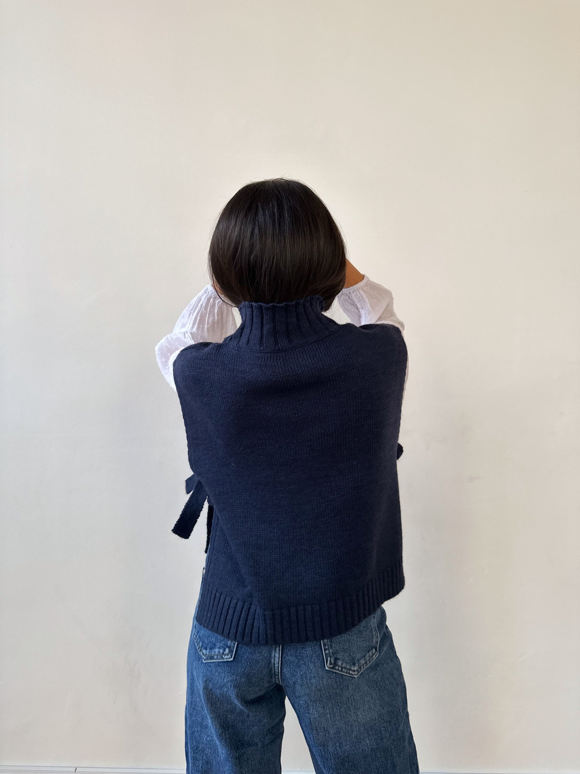 Chaleco de punto en color azul marino con cuello alto y aberturas en los laterales que se anudan con dos lazos