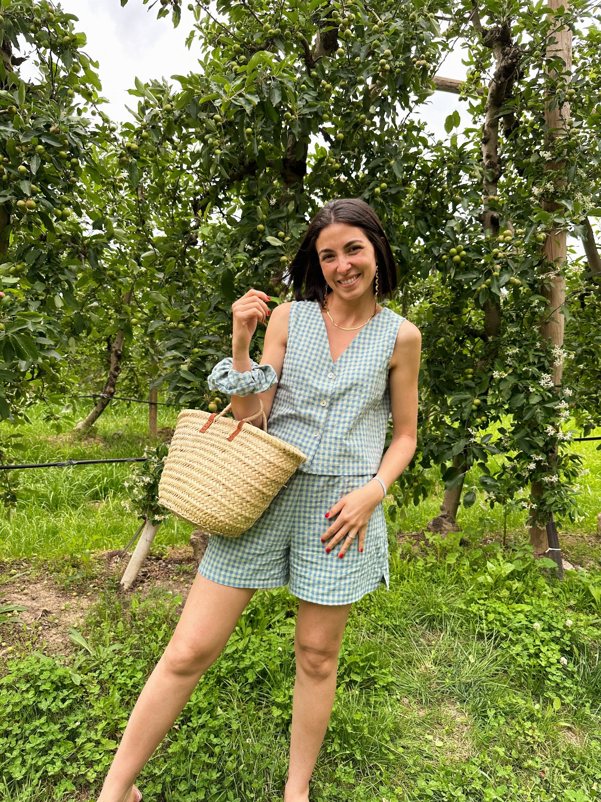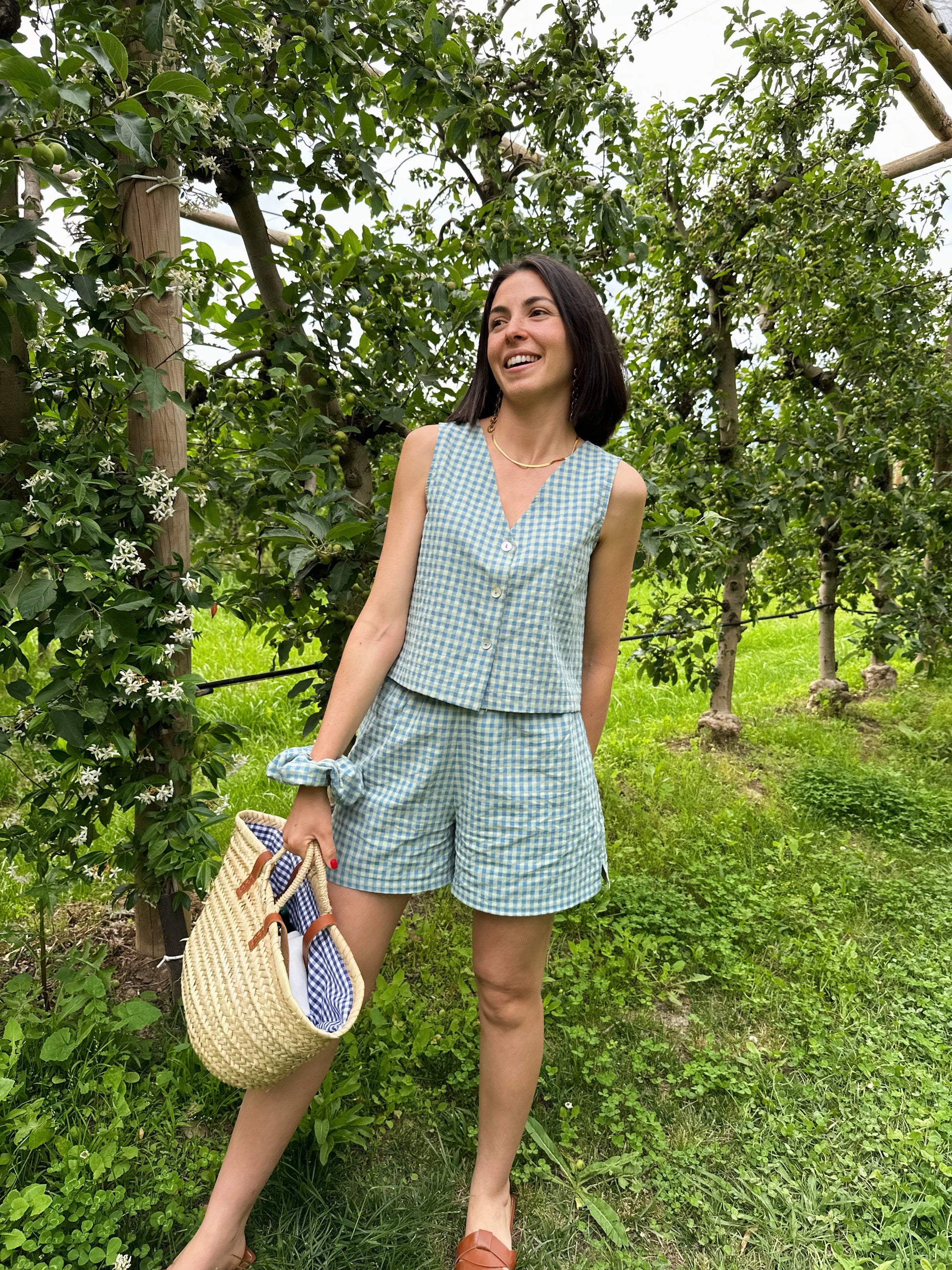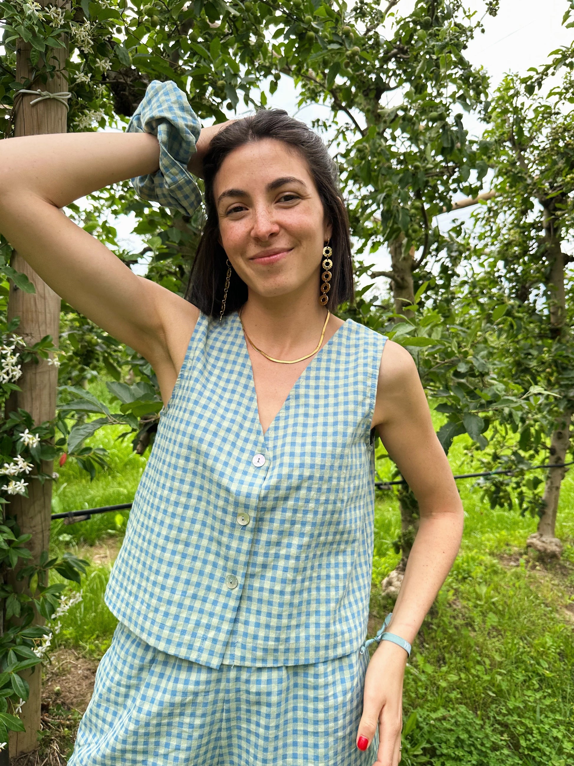 Chaleco corto de vichy, escote pico y abertura central con 3 botones.