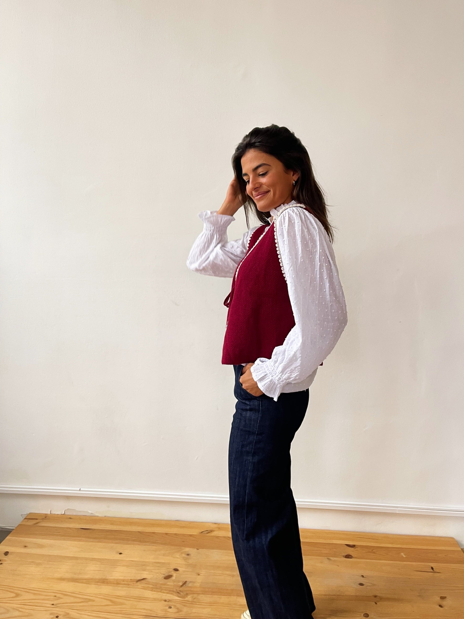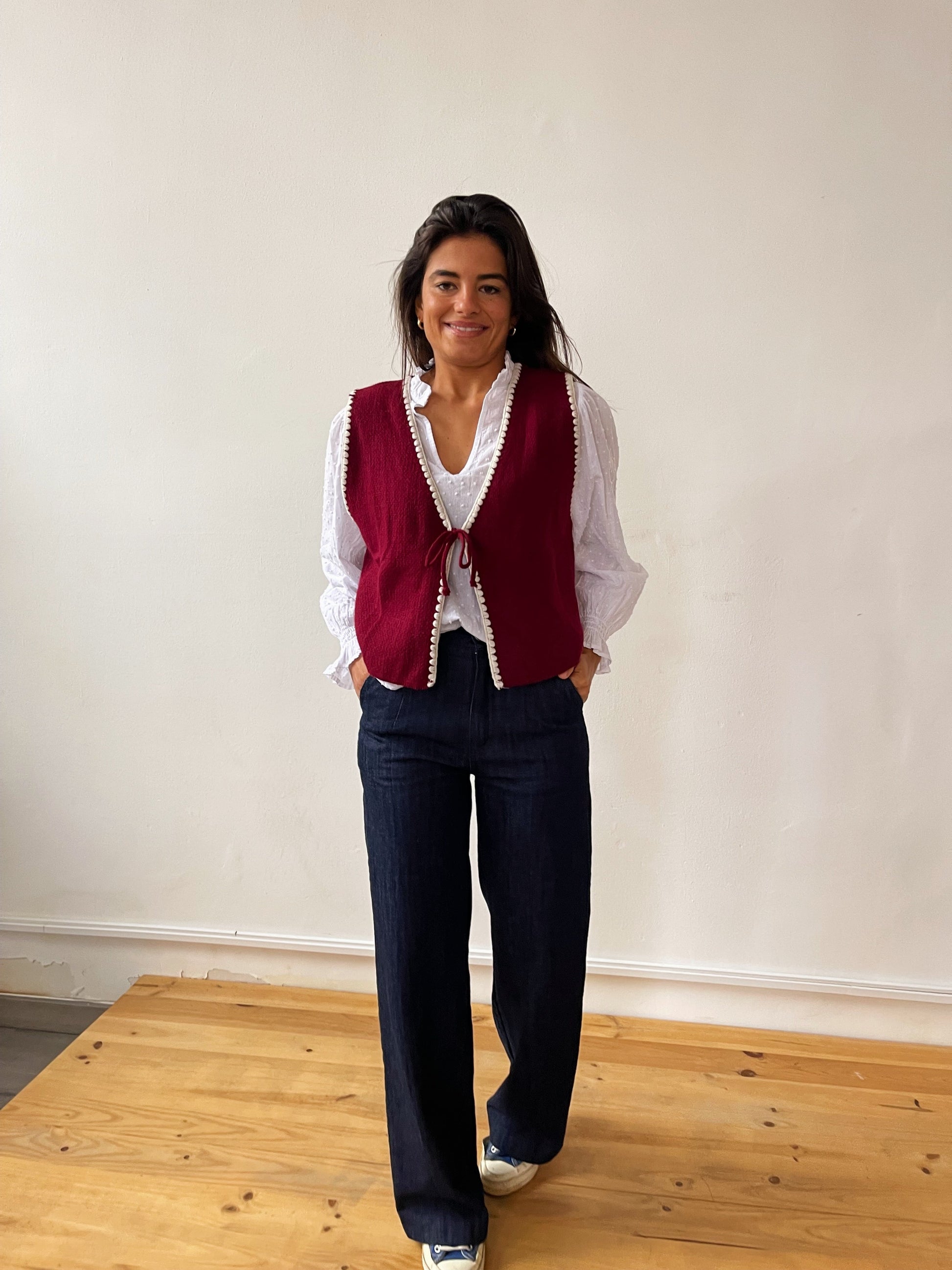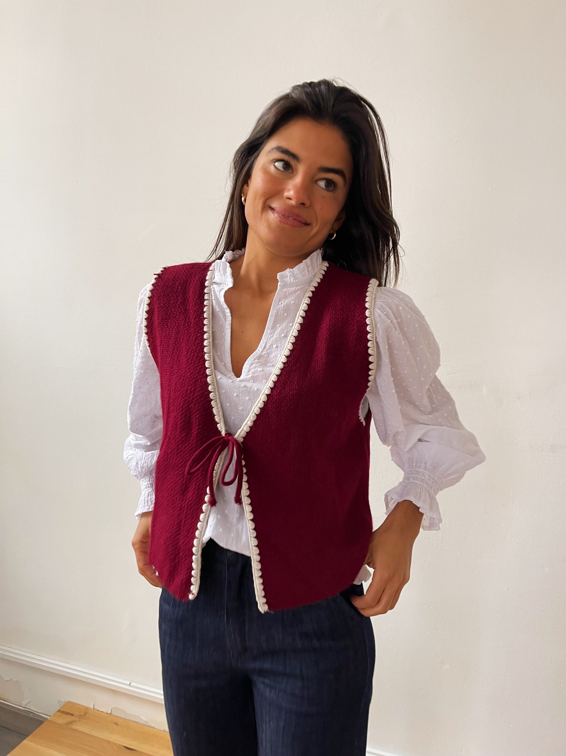 Chaleco de punto en color burgundy y ribete de color beige con atadura de lazo en el centro. Ideal para combinar con nuestras blusas blancas