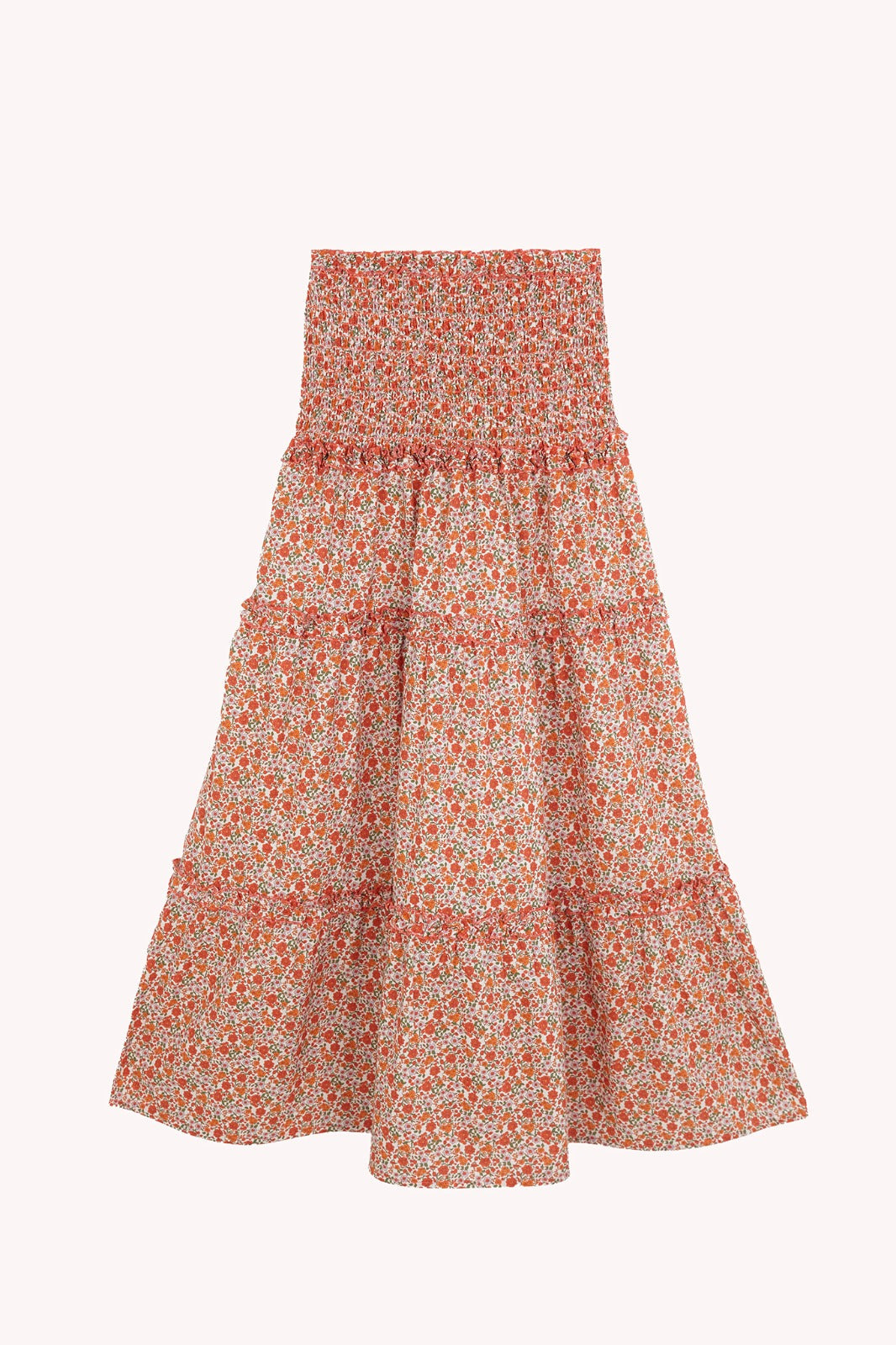 Falda larga con estampado de flores en tonos naranja y rojo. Diseño con volantes creados por secciones elásticas y cintura también elástica para mayor comodidad.