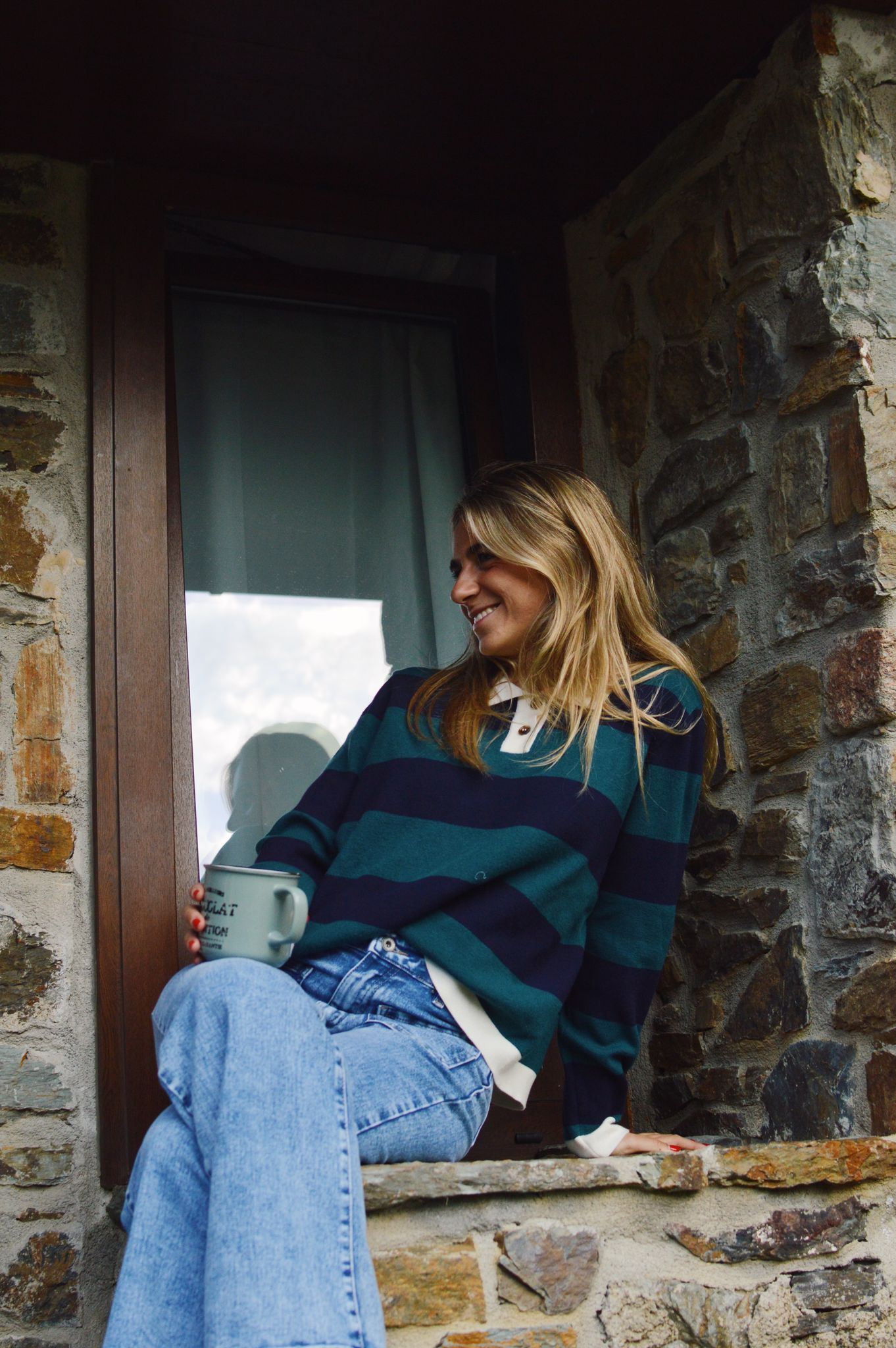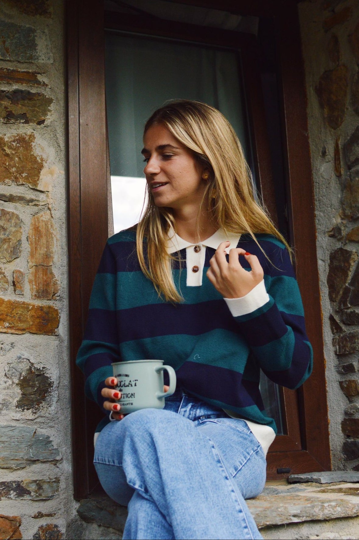 Polo de manga larga bicolor azul marino y verde petróleo con cuello de solapa en color beige. Es un diseño clásico y versátil, ideal para un look sofisticado y lleno de color