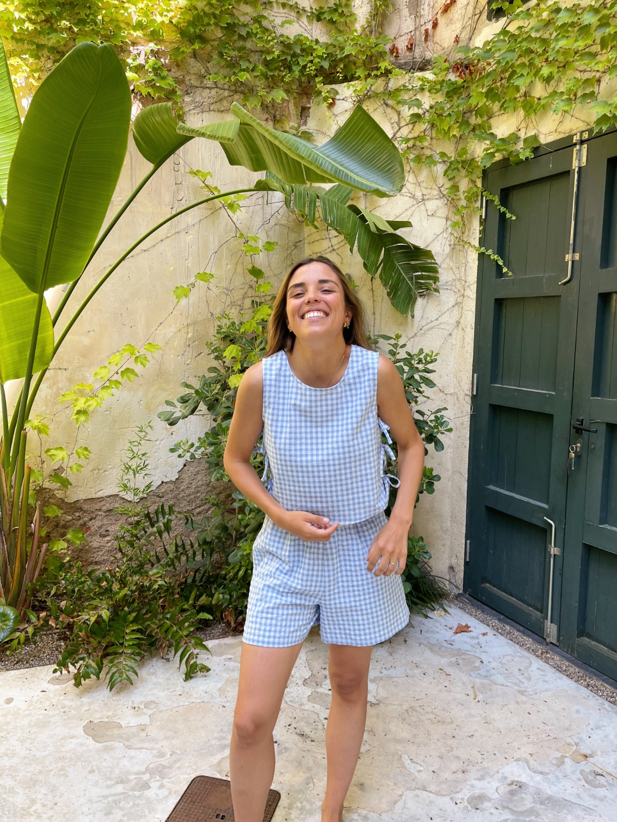 Top de algodón estampado vichy en color celeste con lazos laterales.