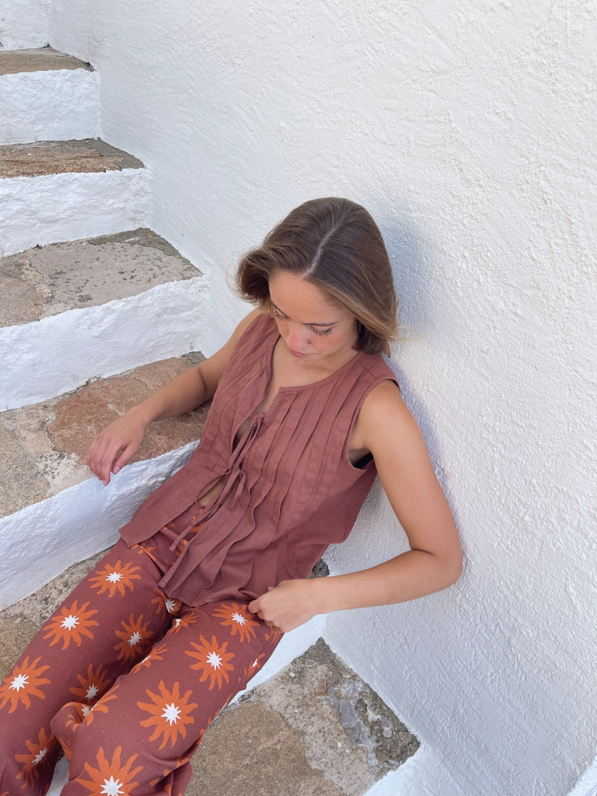 Blusa sin mangas de lino en color marrón con diseño plisado en la parte delantera. Presenta escote con pequeña abertura central ajustada con dos lazos finos.