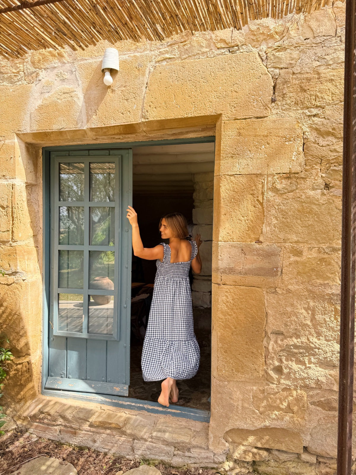 Vestido de cuadros vichy en blanco y azul marino, con cuerpo fruncido, tirantes con vuelo y falda con volante.