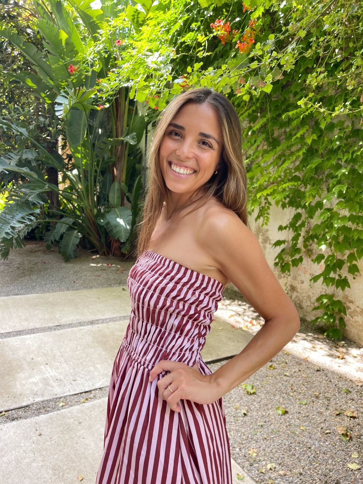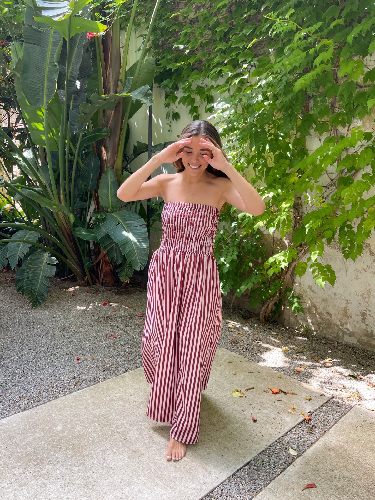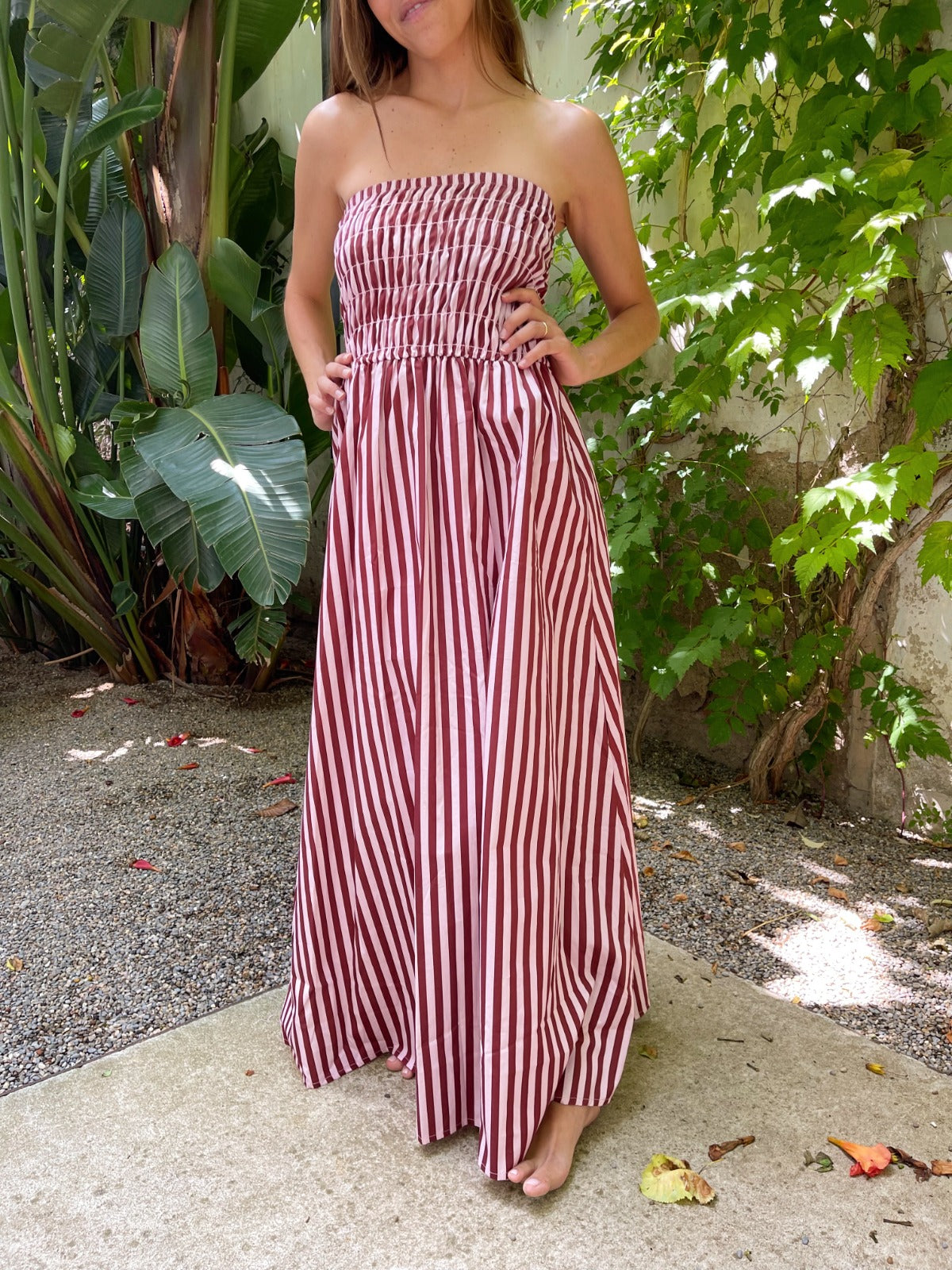 Vestido largo de rayas, escote palabra de honor con nido de abeja en cuerpo. Estampado de rayas en color rosa y marrón.