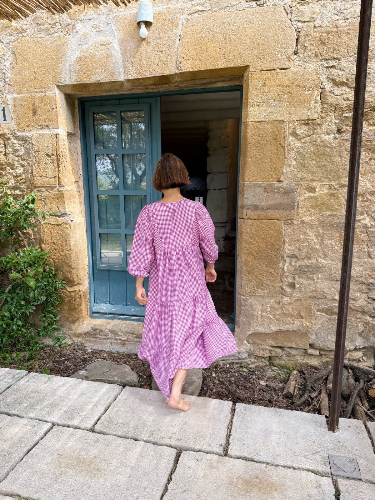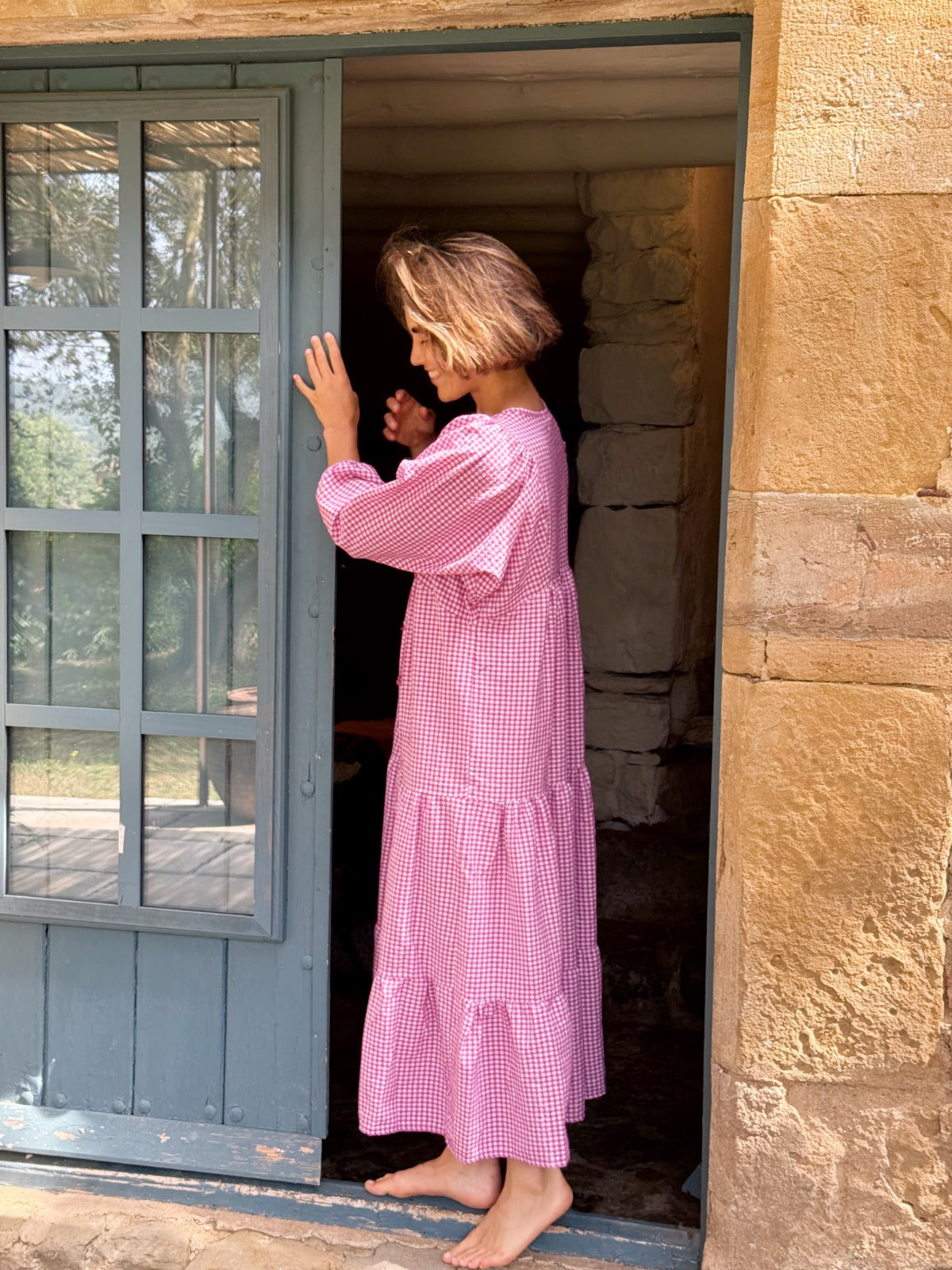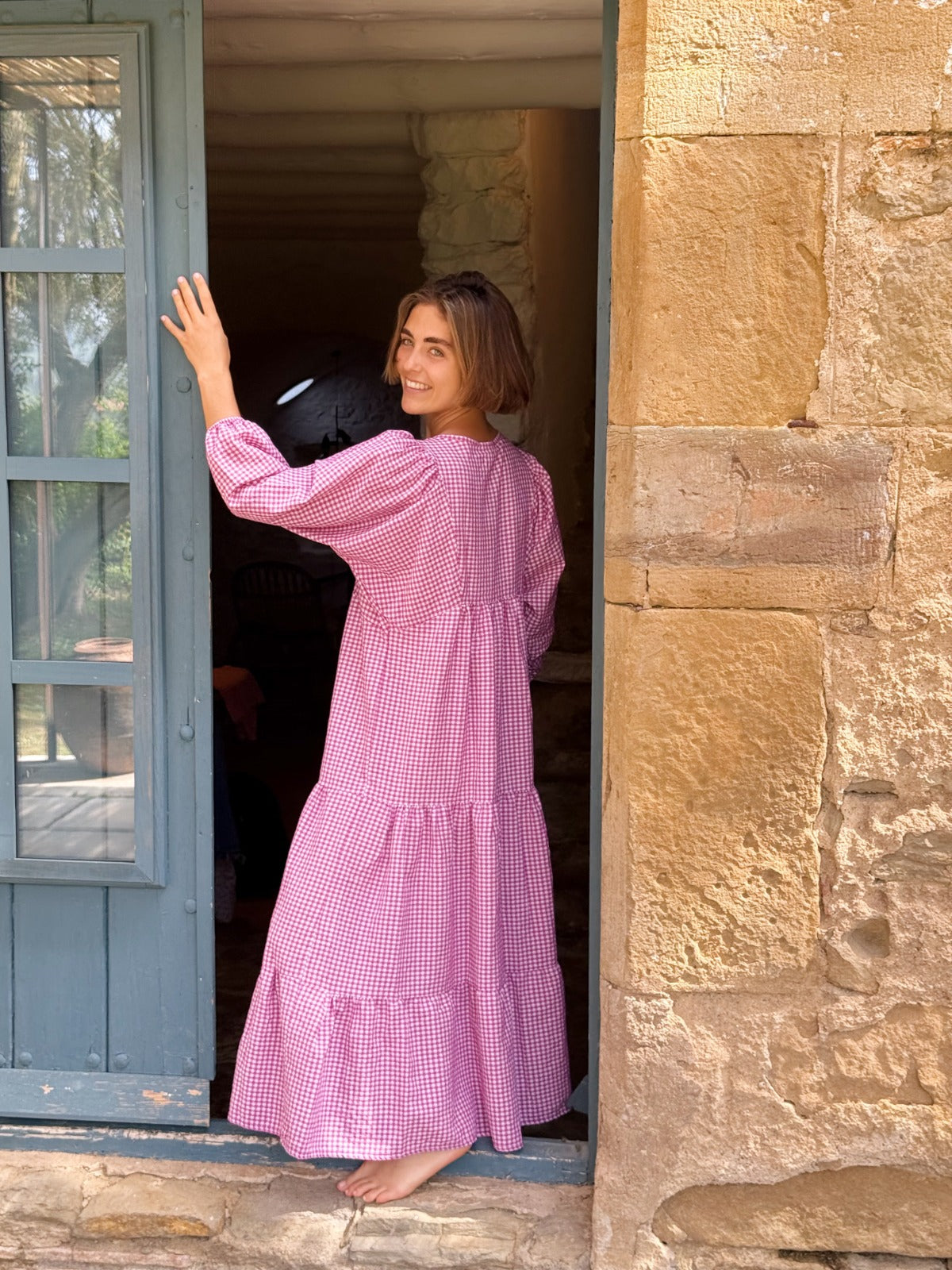 Vestido largo de cuadros vichy en color buganvilla y manga 3 cuartos abollonada. Volantes a lo largo del vestido. Tiene cuello pico y una lazada para poder atar