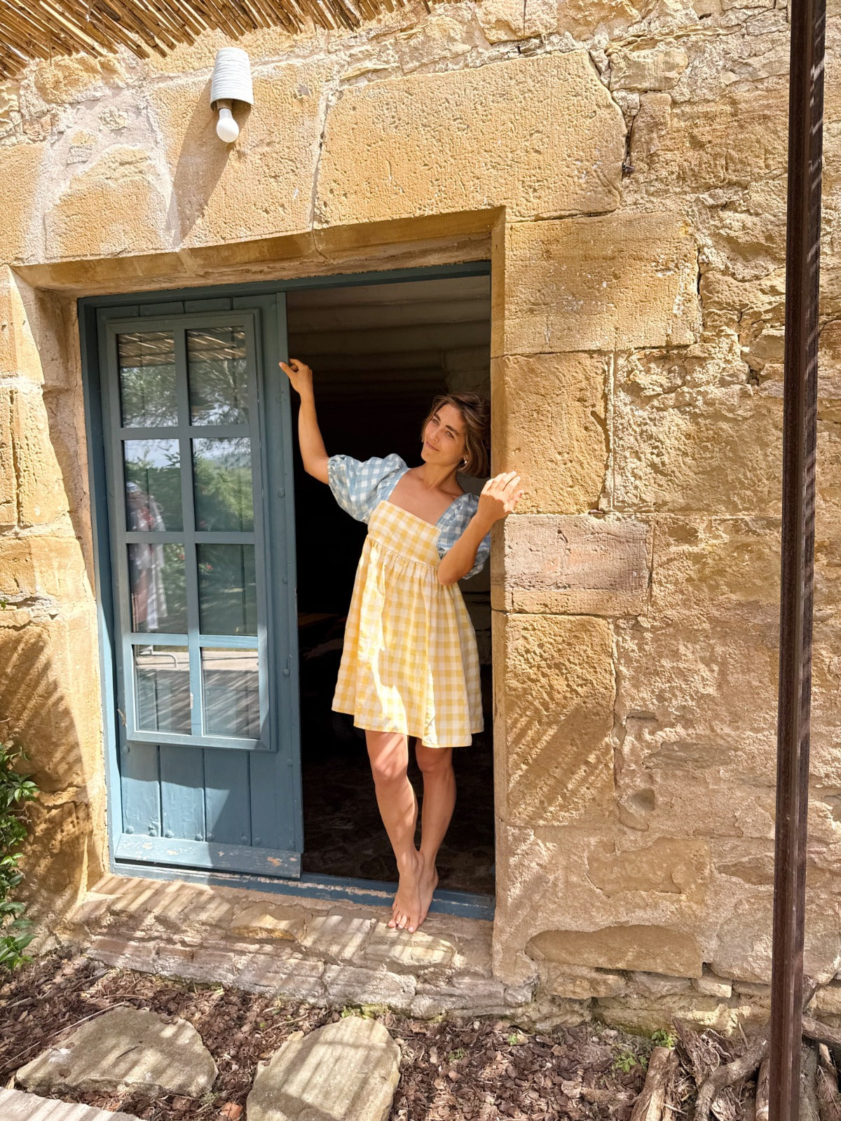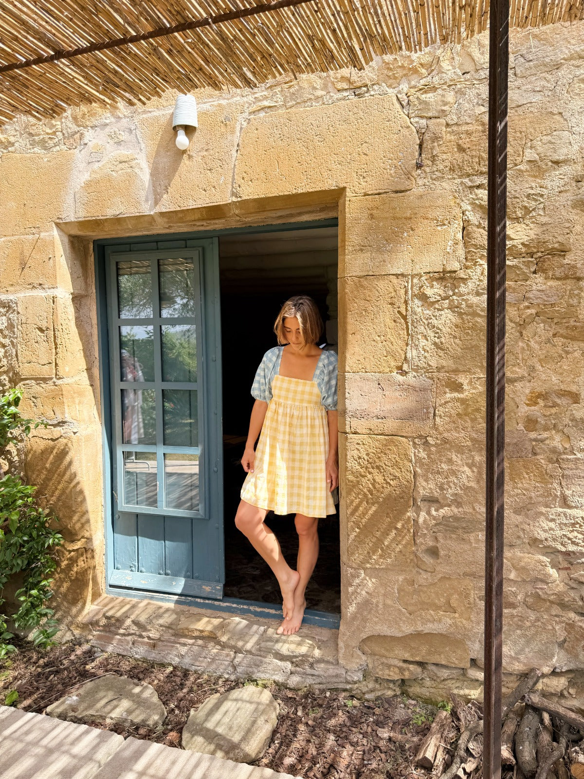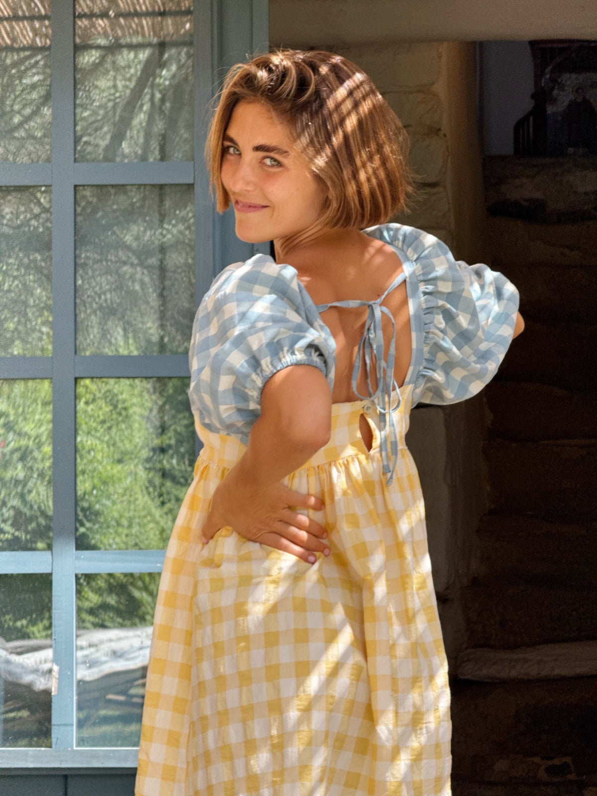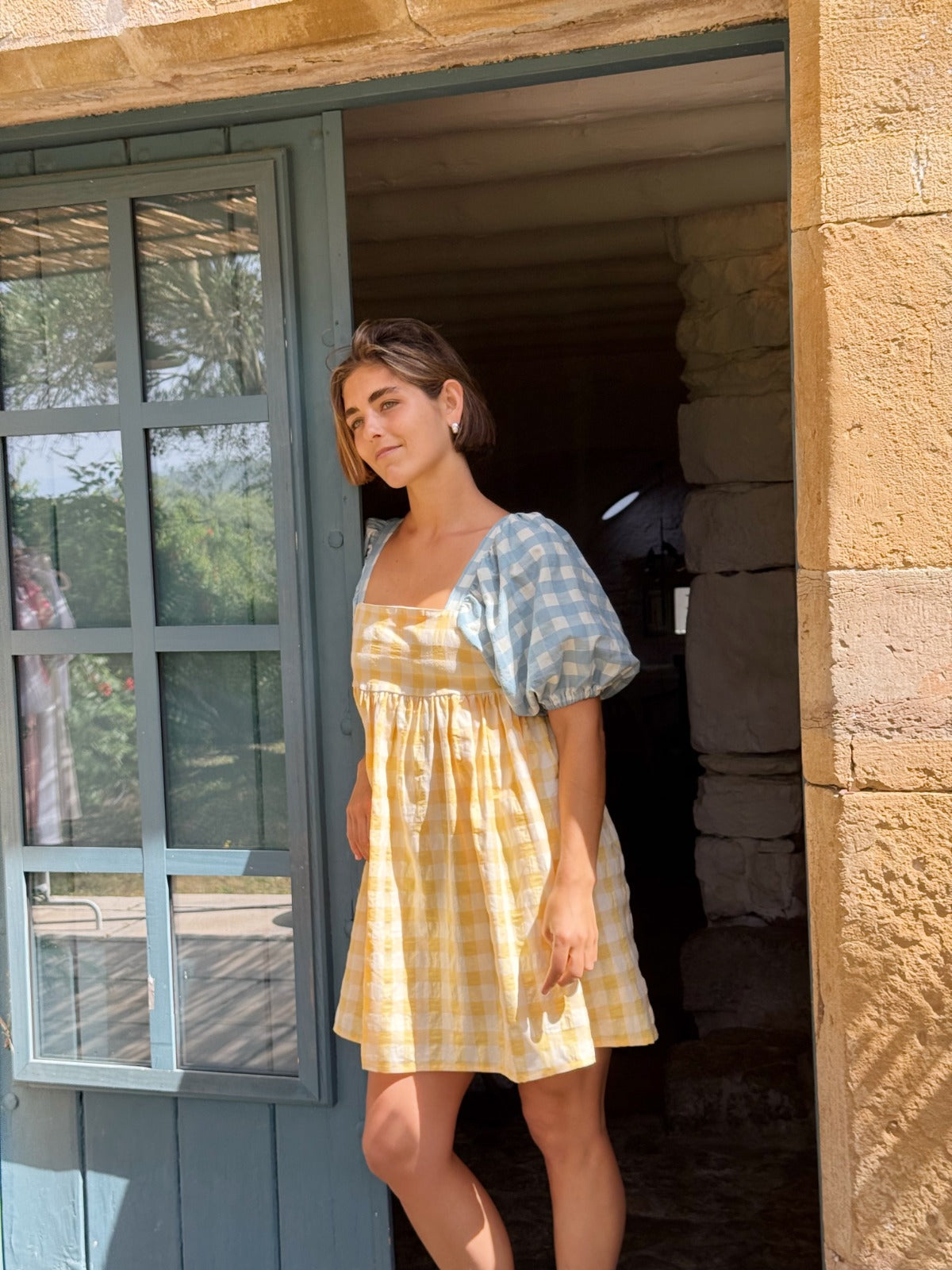 Vestido corto vichy de color amarillo, escote cuadrado, manga corta farol abullonada de vichy en color azul y espalda abierta. Cierre trasero con botón y lazada.