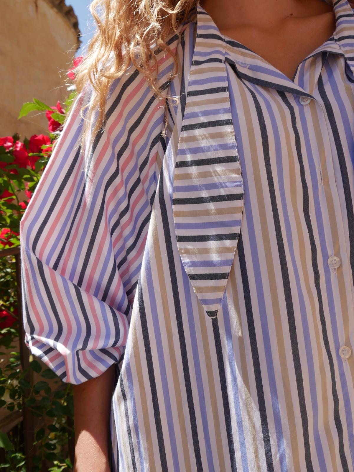 Vestido largo de rayas en tonos azules y beige, mangas abullonadas con estampado de rayas en los mismos tonos azules y rosa. Cierre delantero con lazada.