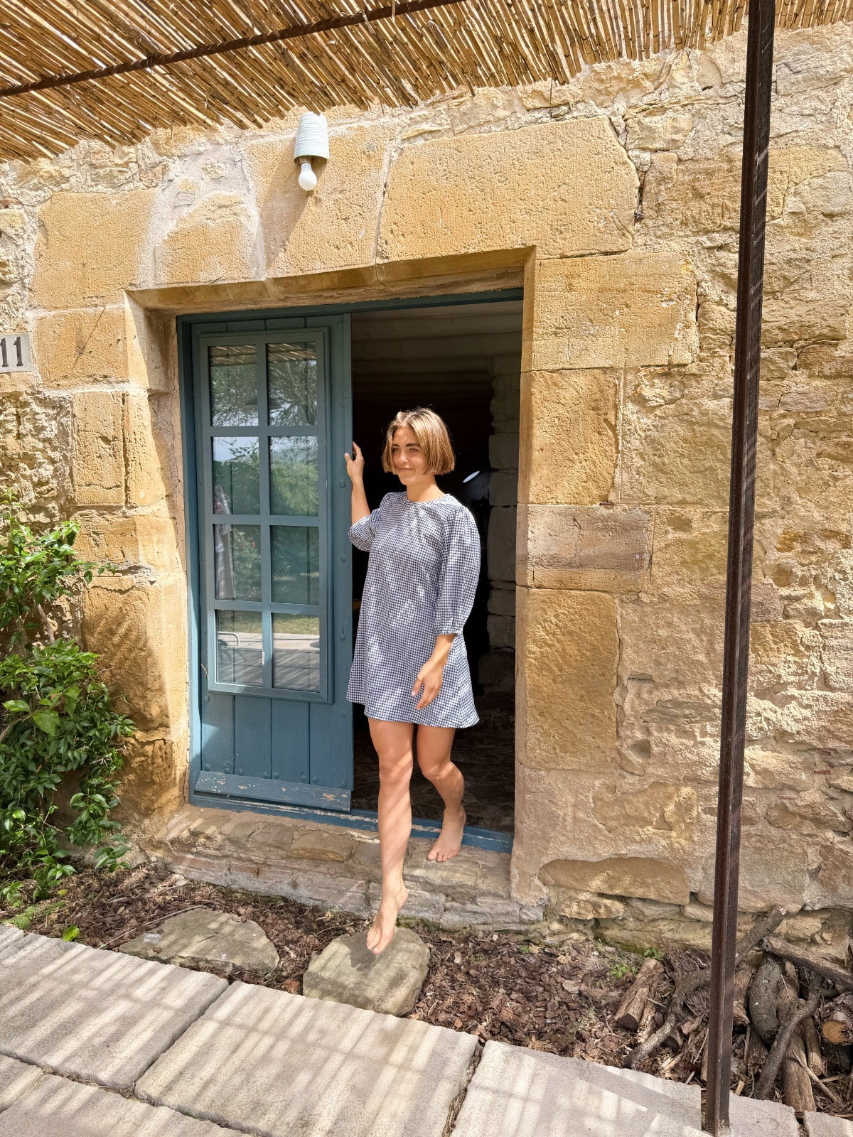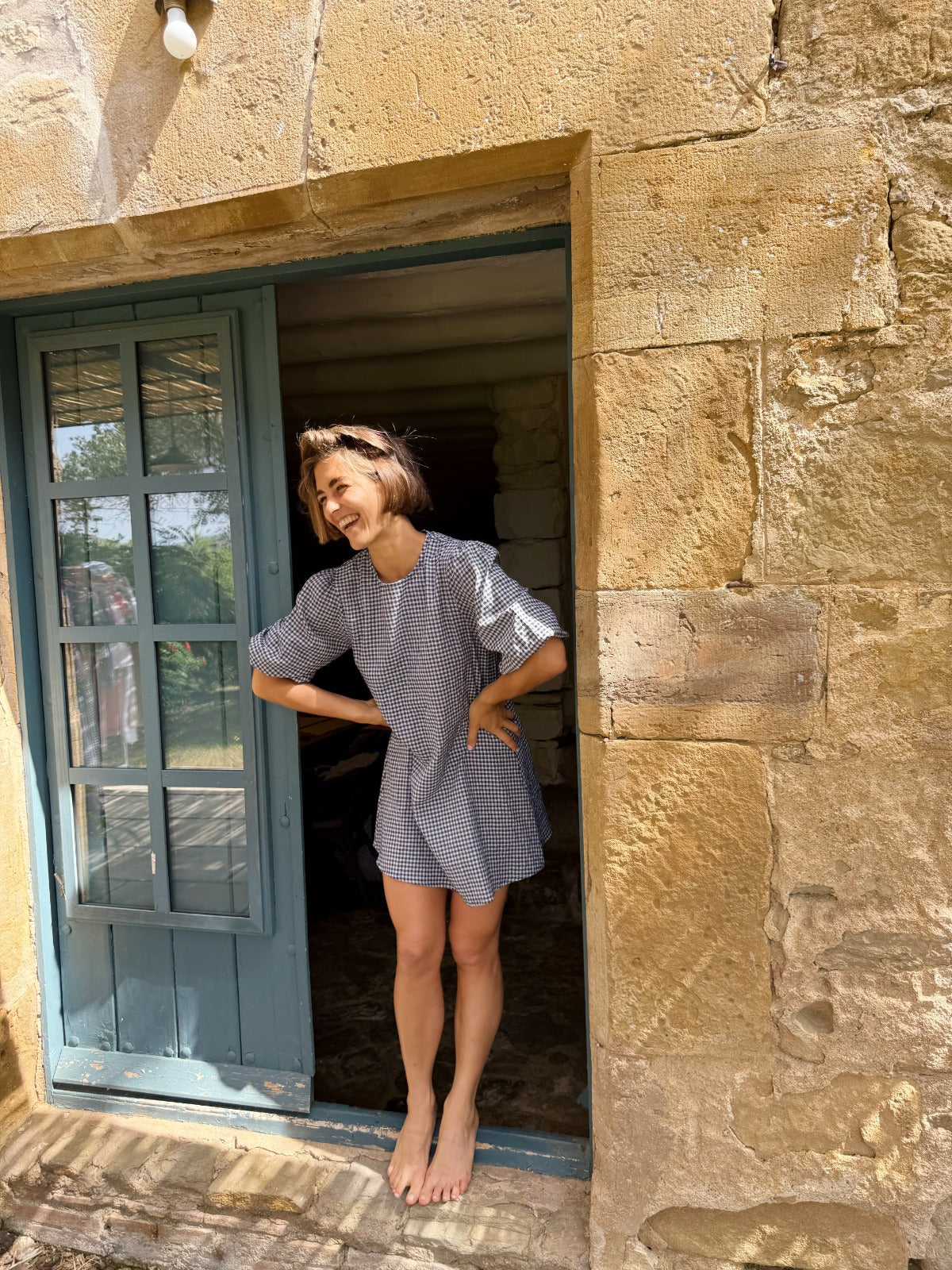 Vestido corto de cuadro vichy en color marino y manga 3/4 abullonada. Cuello cerrado.