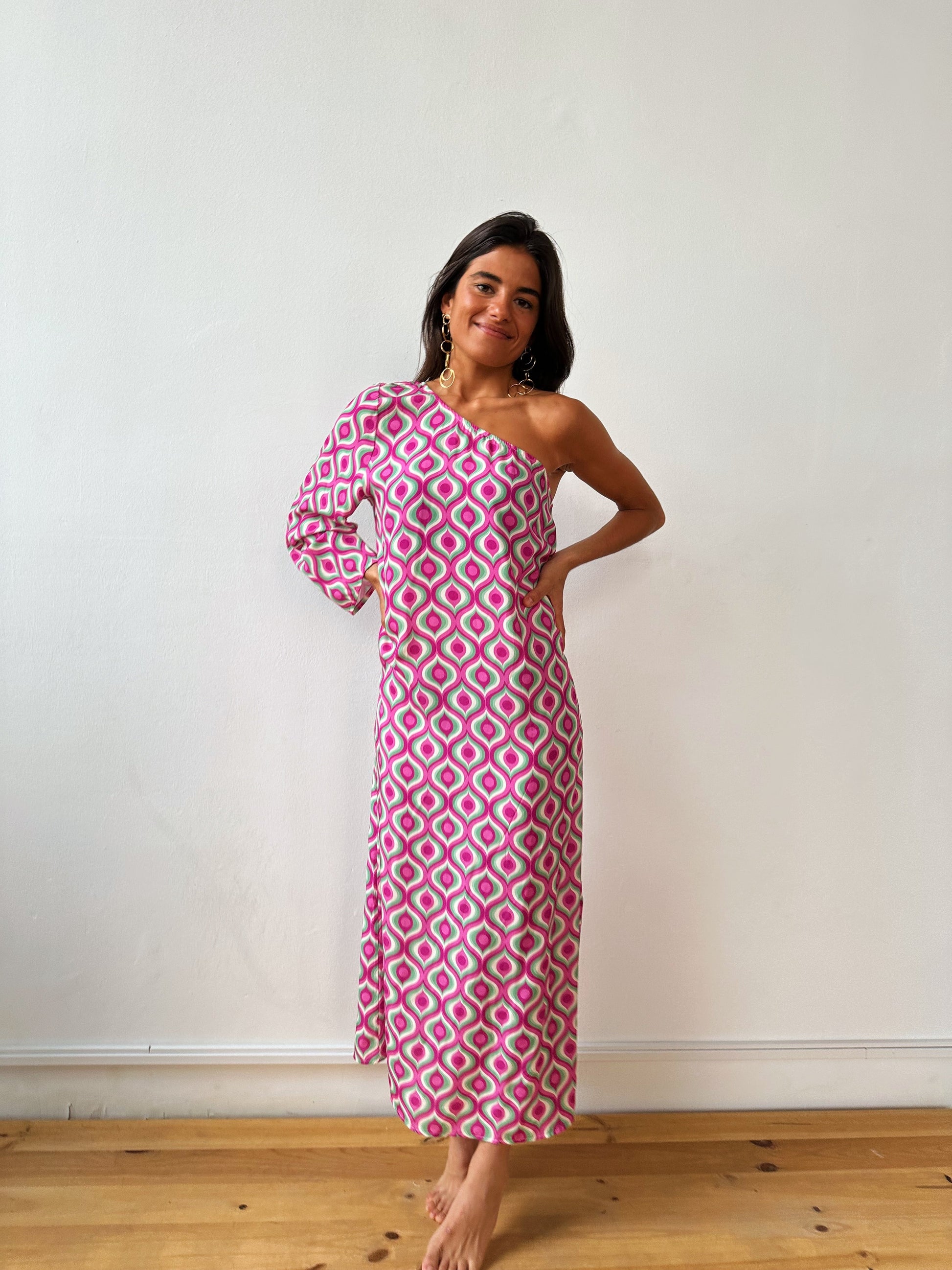 Vestido midi, asimétrico con goma elástica y manga larga .